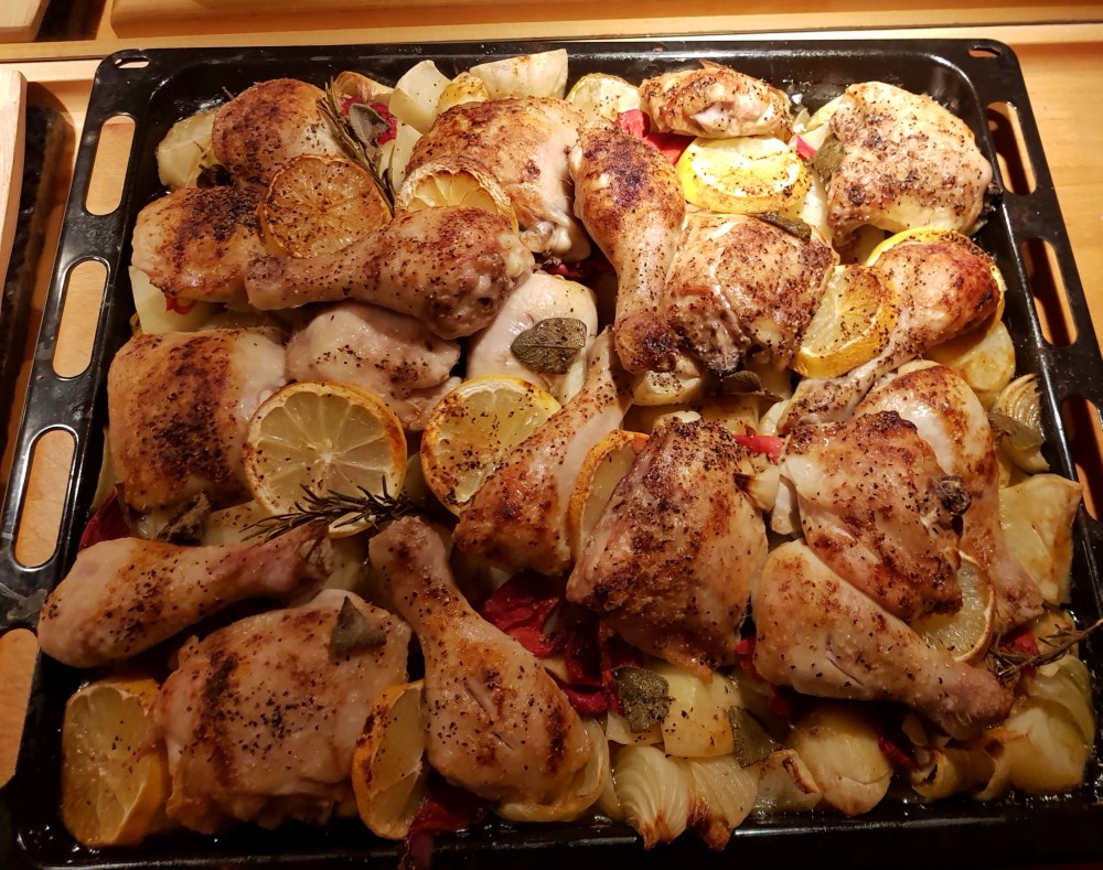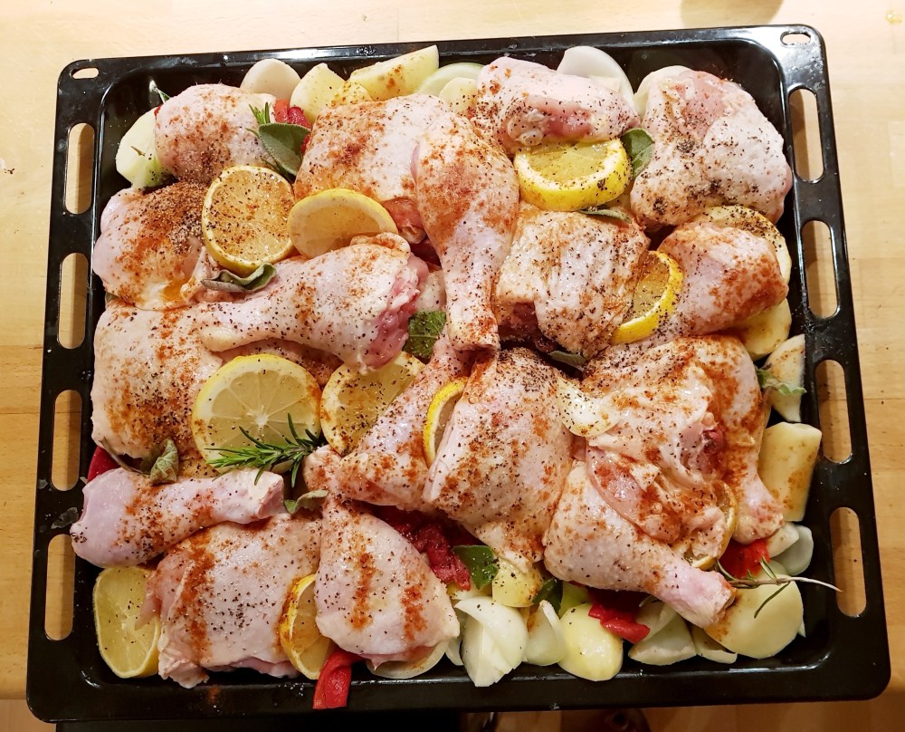 Denne uken var det tid for månedens familiemiddag, en hverdagsmiddag etter jobb, skole og barnehage. Denne gangen ble det en alt-i-ett panne med kyllinglår, dvs jeg brukte kyllingklubber som består av lår pluss overlår. Jeg deler dem alltid der disse to henger sammen. Overlårene har nok mest kjøtt, men også mer ben enn selve låret. Vi var 6 voksne og 2 barn, de sistnevnte spiste ikke så mye. Jeg brukte litt over 2 kg med klubber og disse ble nesten spist opp. I tillegg brukte jeg poteter, løk, hvitløk, sitron og paprika pluss litt fersk salvie og fersk rosmarin. Salt, pepper og paprikapulver.
