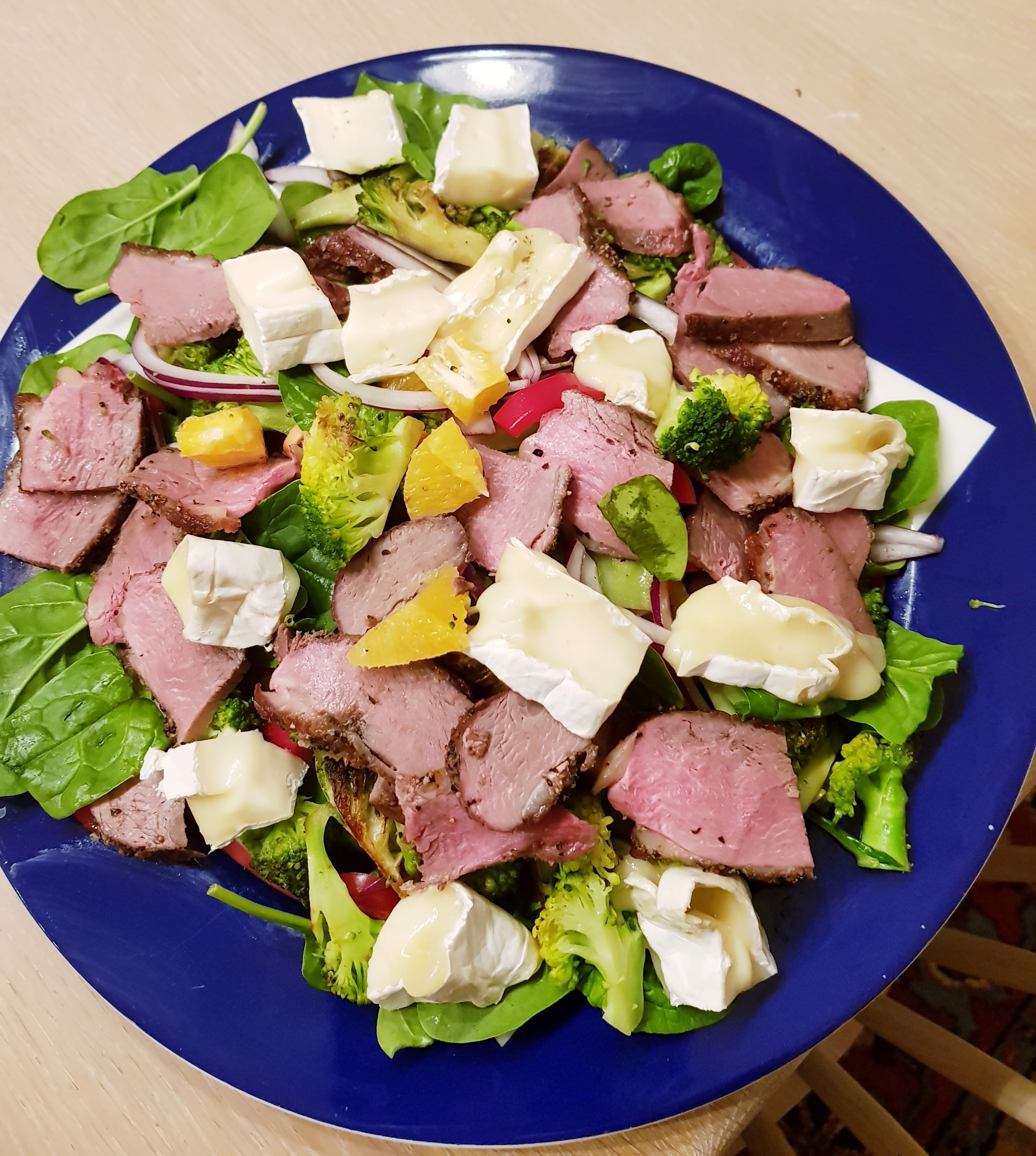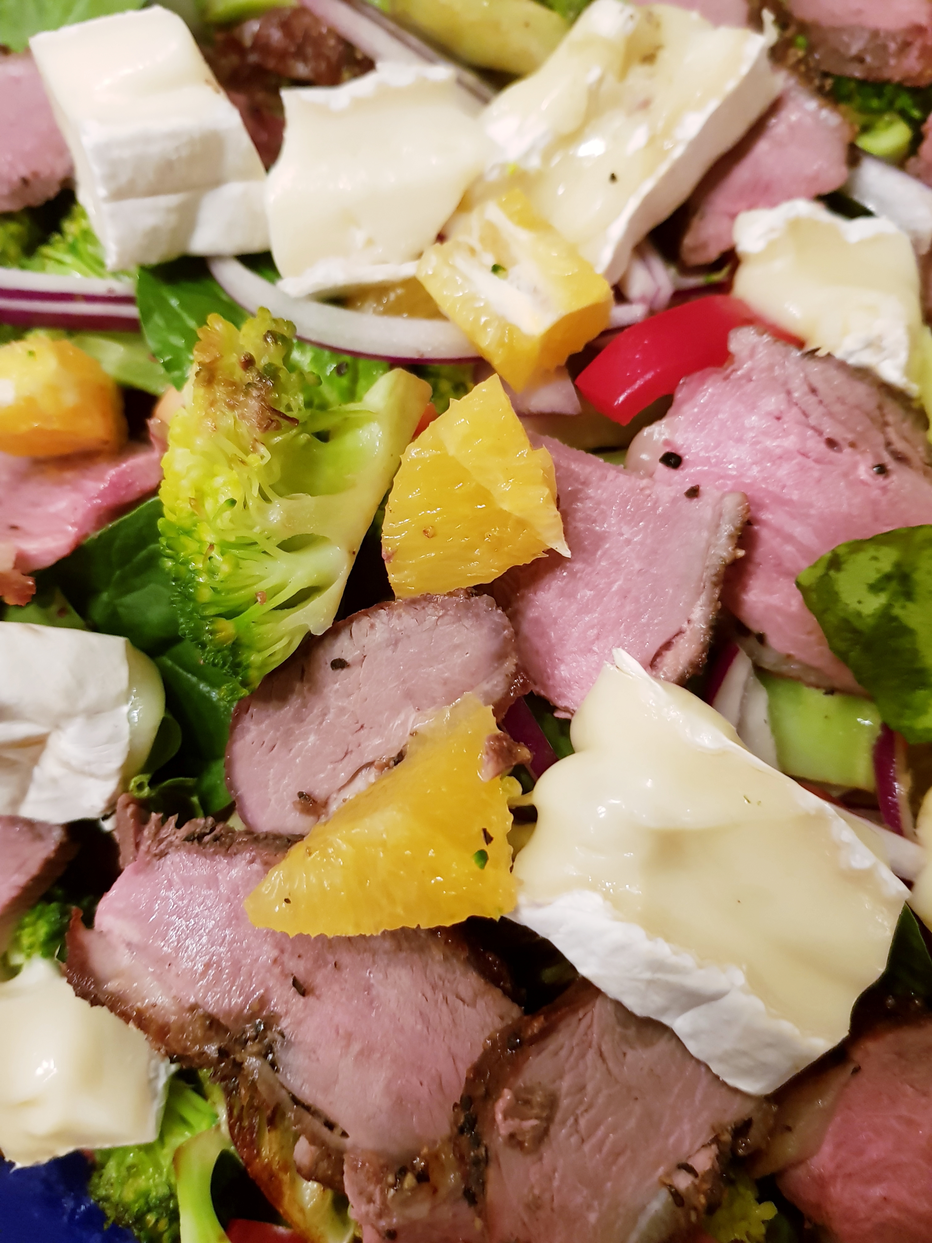 Dekket en stor tallerken med salat- her er brukt babyspinat. En rød paprika og en skrelt appelsin ble skåret i biter og fordelt over. En halv rødløk ble renset og skåret i tynne skiver som også ble fordelt over. En brokkoli ble delt i buketter som ble skåret i mindre skiver og kokt i saltet vann i 1 minutt. Kokevannet ble helt av og brokkolien ble stekt på varm panne i litt rapsolje før den også ble fordelt over fatet. Et stykke brie ble varmet ca 1 minutt i mikrobølgeovnen (du kan varme den på en stekepanne hvis du ikke har mikrobølgeovn) og skåret i biter. Kjøttet som her var andebryst, var krydret godt med salt, grov pepper og spisskummin før steking, noe som ga salaten en veldig god smak. Spisskummin og appelsin er godt sammen.
