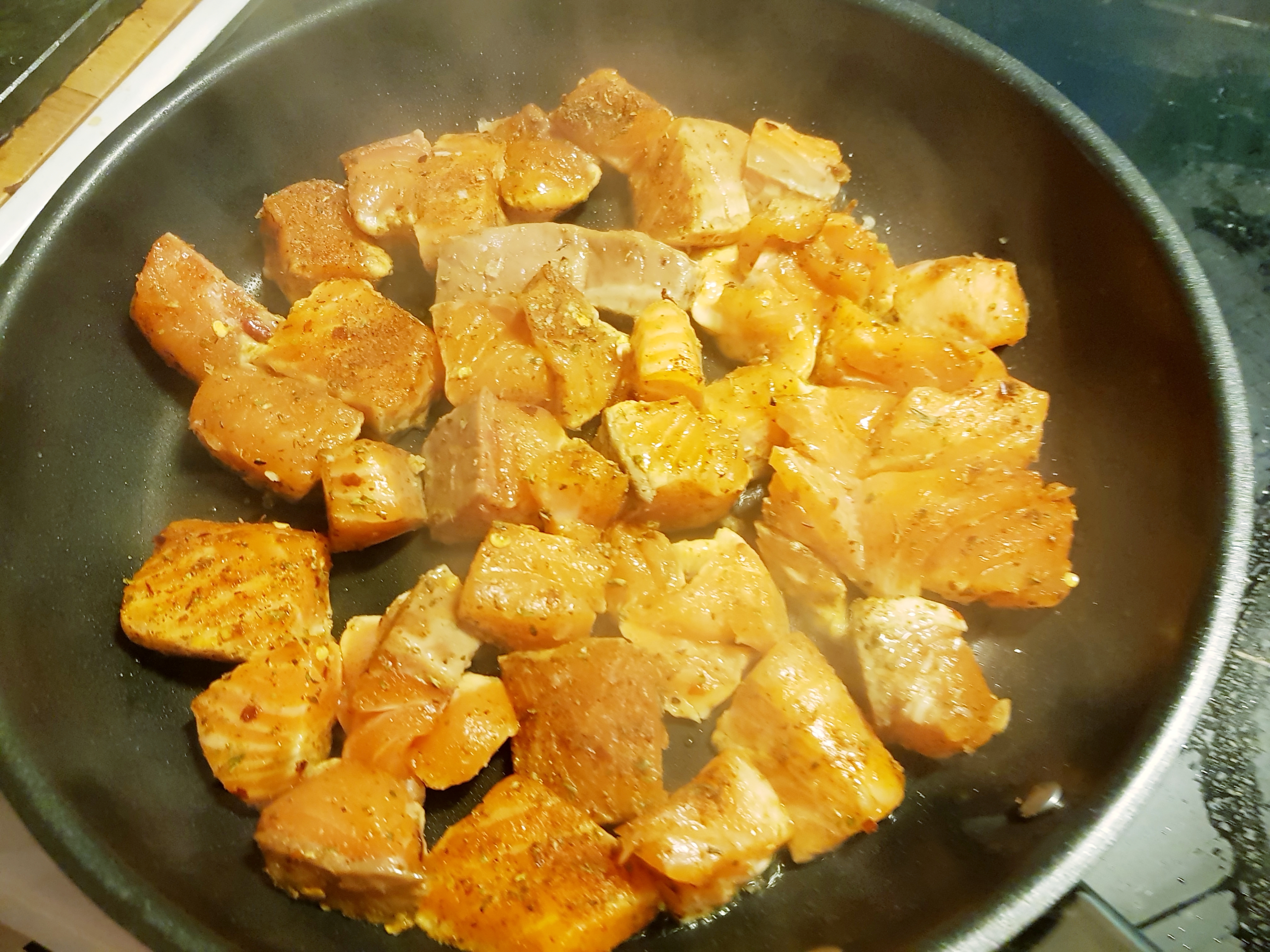 Til fisken blandet jeg 1/2 ts malt spisskummin, 1/2 ts paprikapulver, 1/2 ts tørket oregano og en klype med chiliflak (du kan bruke chilipulver også) og en klype vanlig koksalt. Fisken ble skåret i terninger og blandet med krydderet i en skål for deretter å stekes på god varme i olje.
