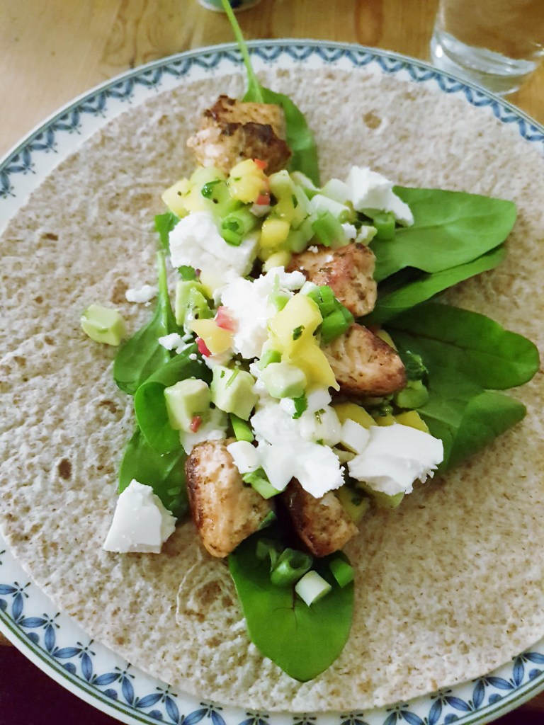 Taco er ikke bare kjøttdeig- du kan jo fylle tortillalefser med hva du vil-rester etter middag eller annet du måtte ha for hånden. Her har jeg brukt laksefilet etter inspirasjon fra Meny og blandet sammen krydderet selv. Istedenfor en mer flytende salsa som du får kjøpt på glass eller noe rømmeliknende, er det her brukt fetaost og en salsa av frukt.