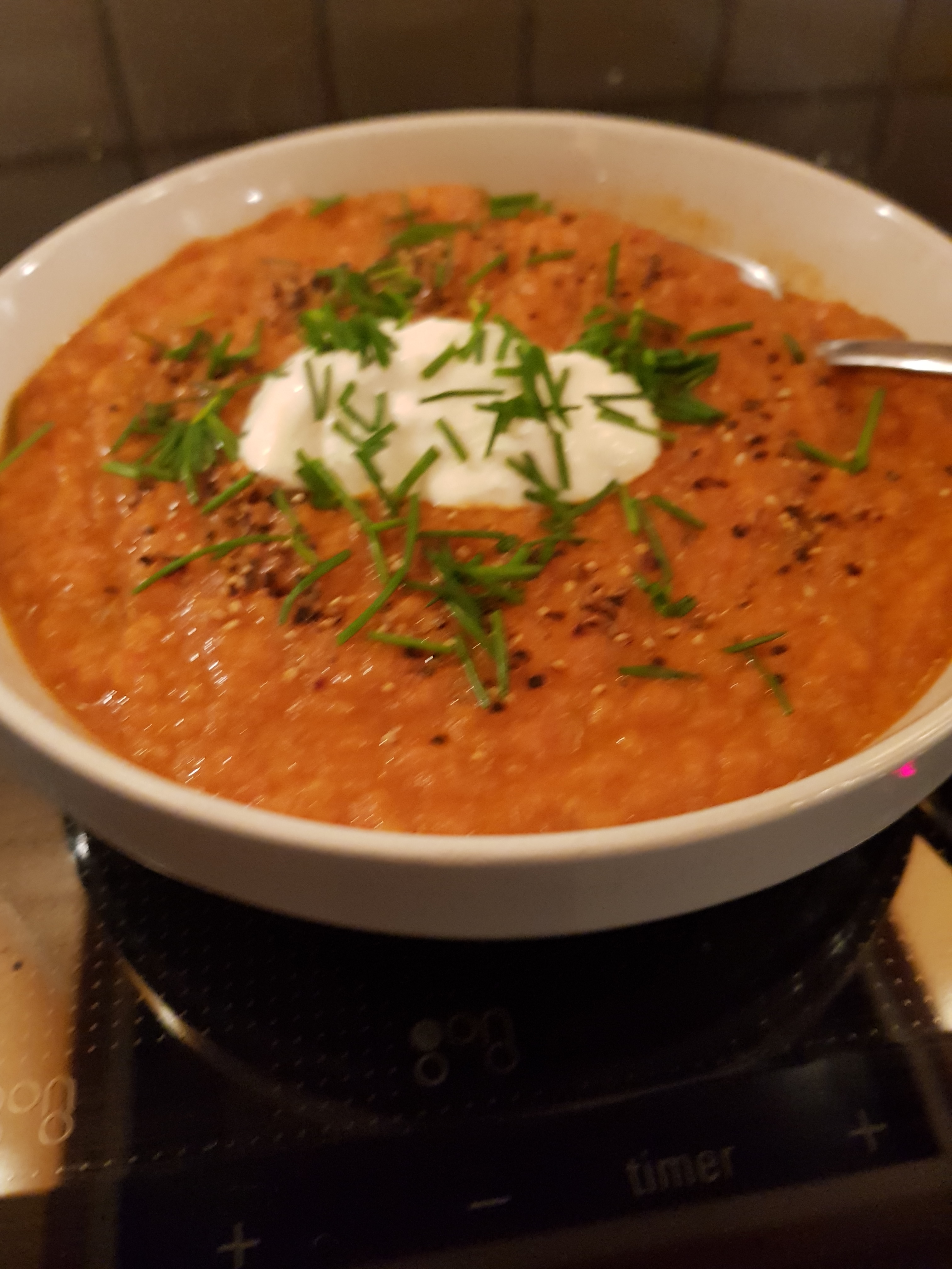 Suppen ble servert med grovt flatbrød, en klatt tyrkisk yoghurt, et ekstra dryss med grov pepper og litt gressløk. Kraftig og mettende suppe med gode smaker 🙂