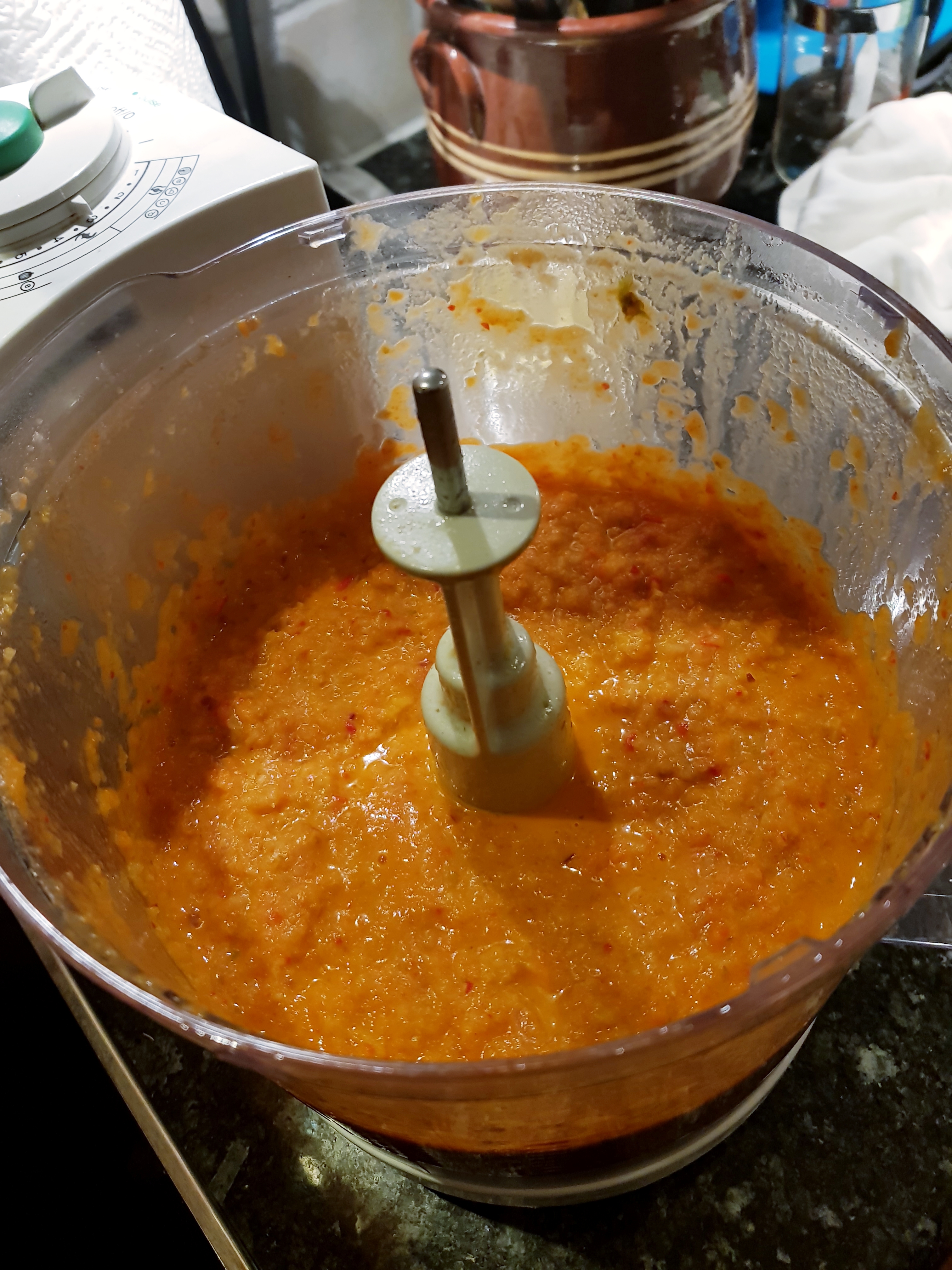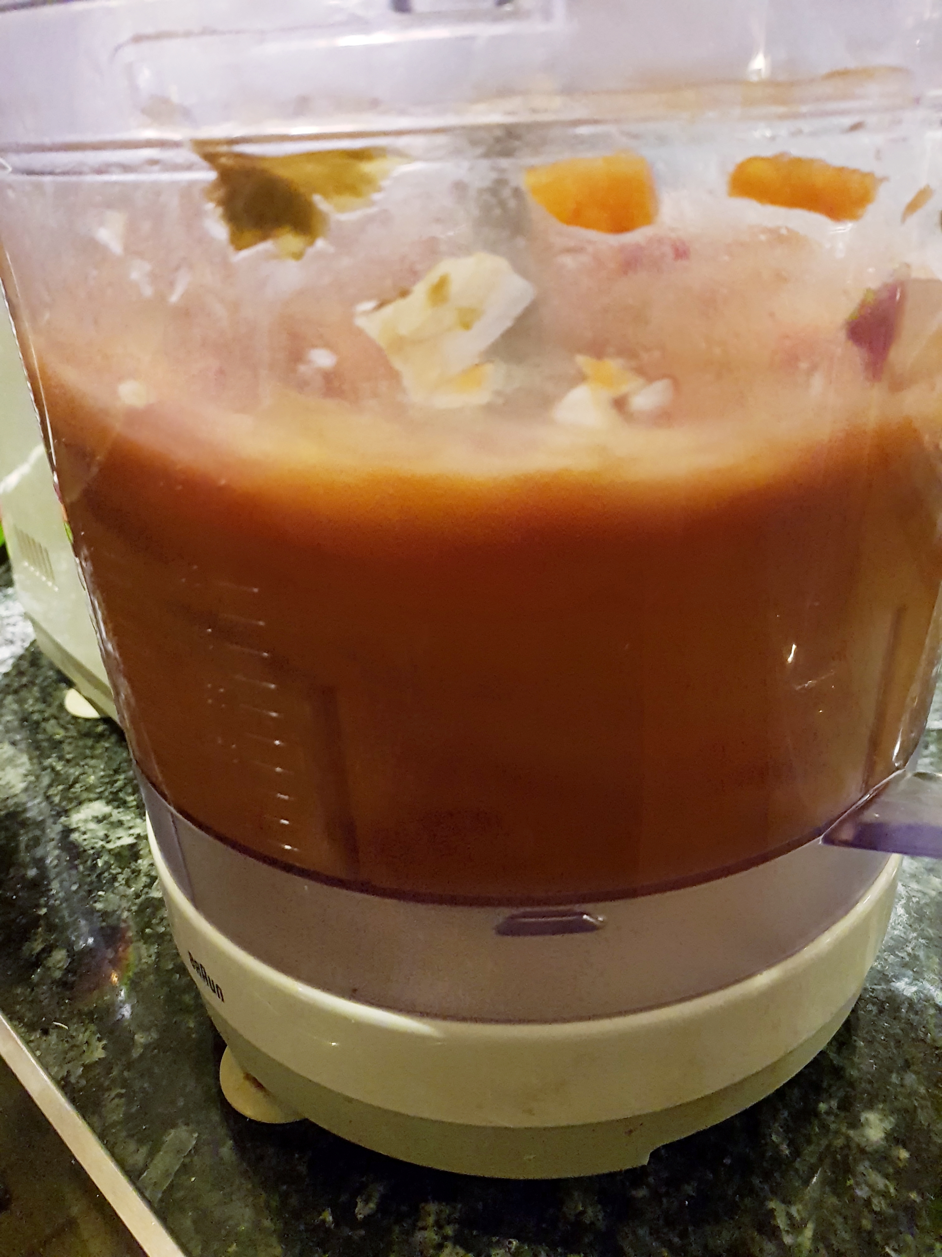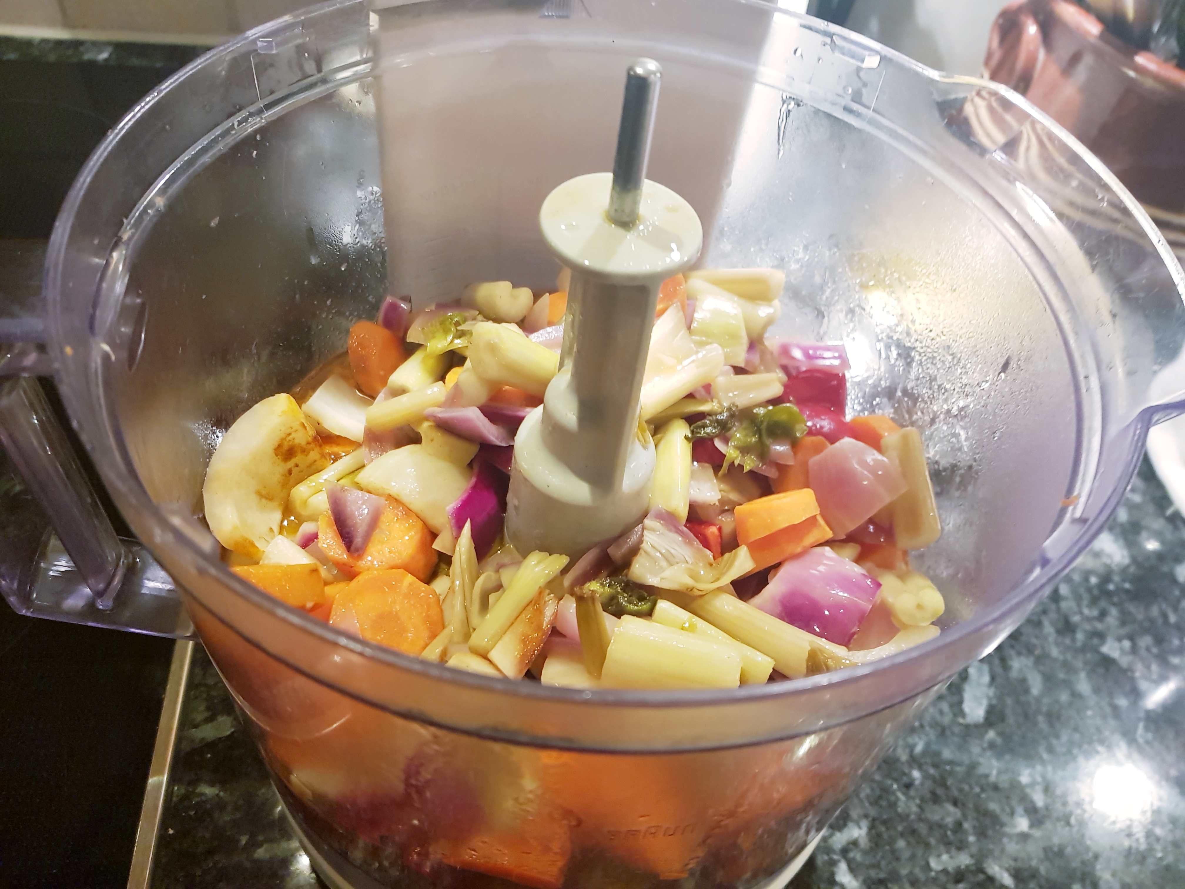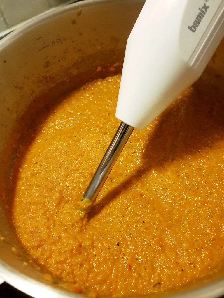 De stekte grønnsakene og kraften ble overført til en foodprossessor og kjørt til en jevn masse.