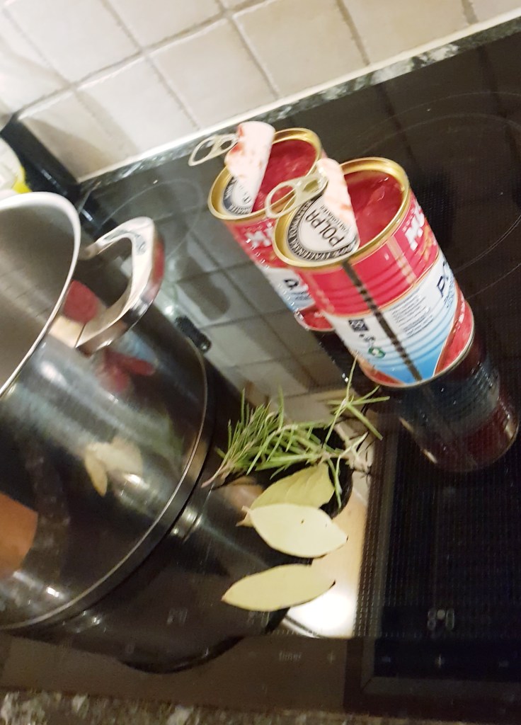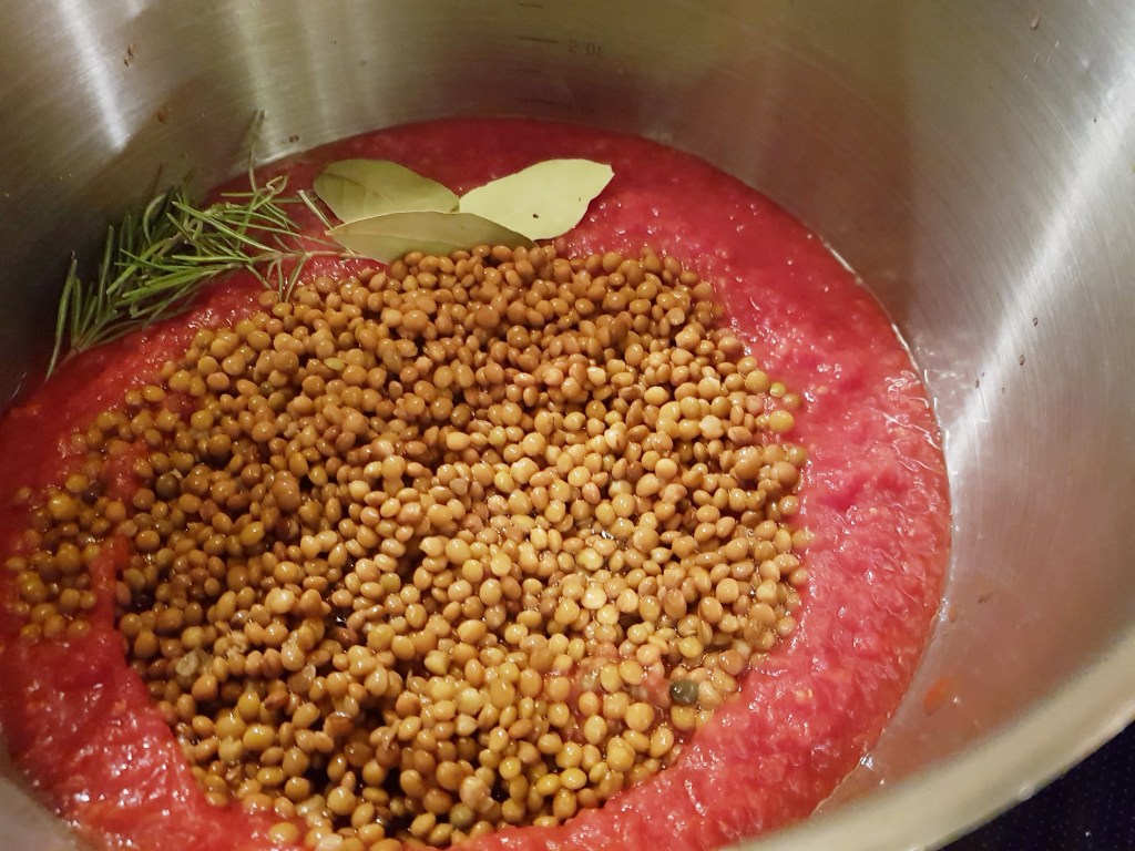 Tomatene ble tilsatt en stor gryte sammen med rosmarin og laurbærblader. De ferdigkokte linsene ble også tilsatt. Bruker du hermetiske ferdigkokte linser så må du skylle dem godt først og så tilsette dem i gryta sammen med grønnsaksblandingen.