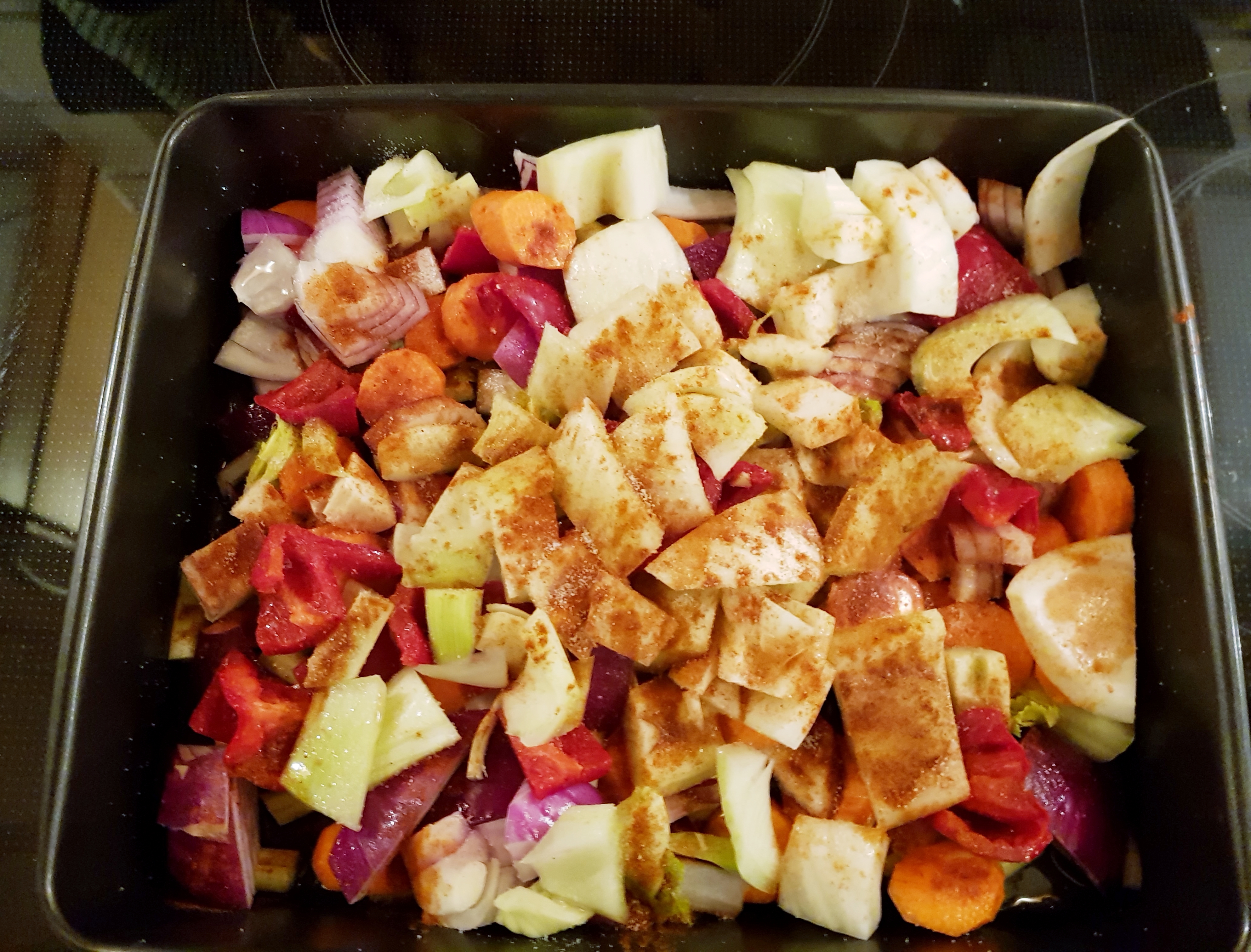 Alle grønnskaene ble kuttet i grove biter og plassert i en ovnsfast form. Paprikapulver, rapsolje og litt salt ble blandet med grønnsakene og formen ble satt inn i en forvarmet ovn på 170 gr C.