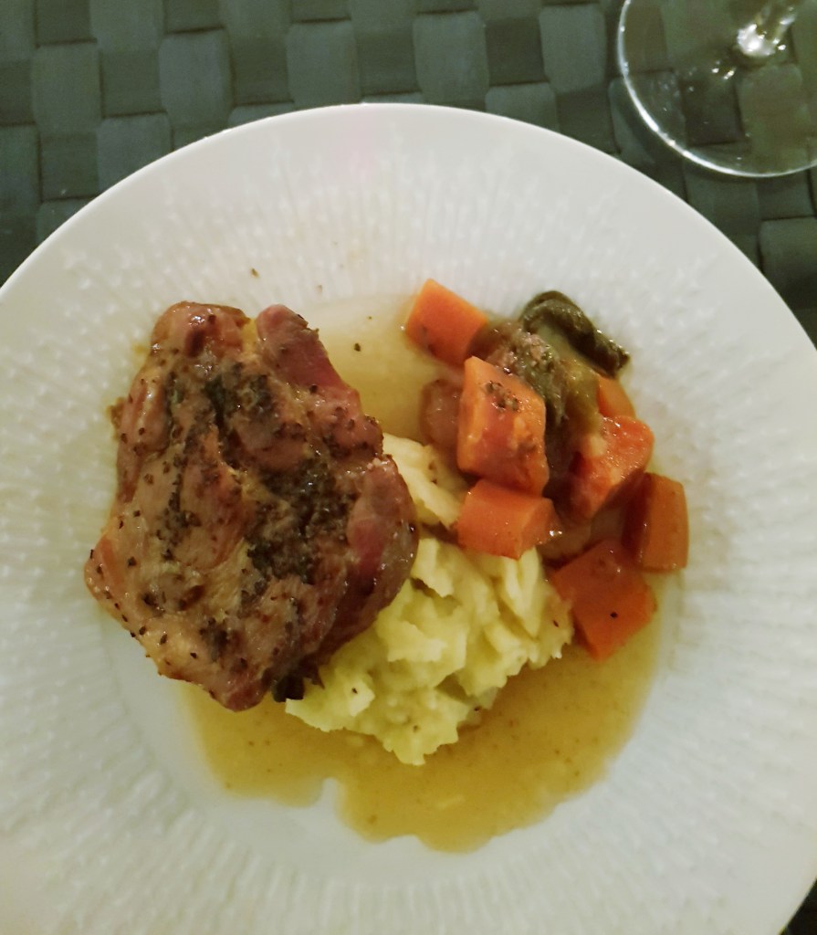 Skyen som danner seg har en fabelaktig smak av surt og søtt, kjøttet er kjempemørt, eplene er så og si borte og ligger svøpt rundt gulerøttene og sitronen er karamellisert og nytes av slike som meg. Retten ble servert med hjemmelaget potetmos eller potetstappe som vi sier der jeg kommer fra. Litt grov hverdagsstappe laget med smør og potetvann.