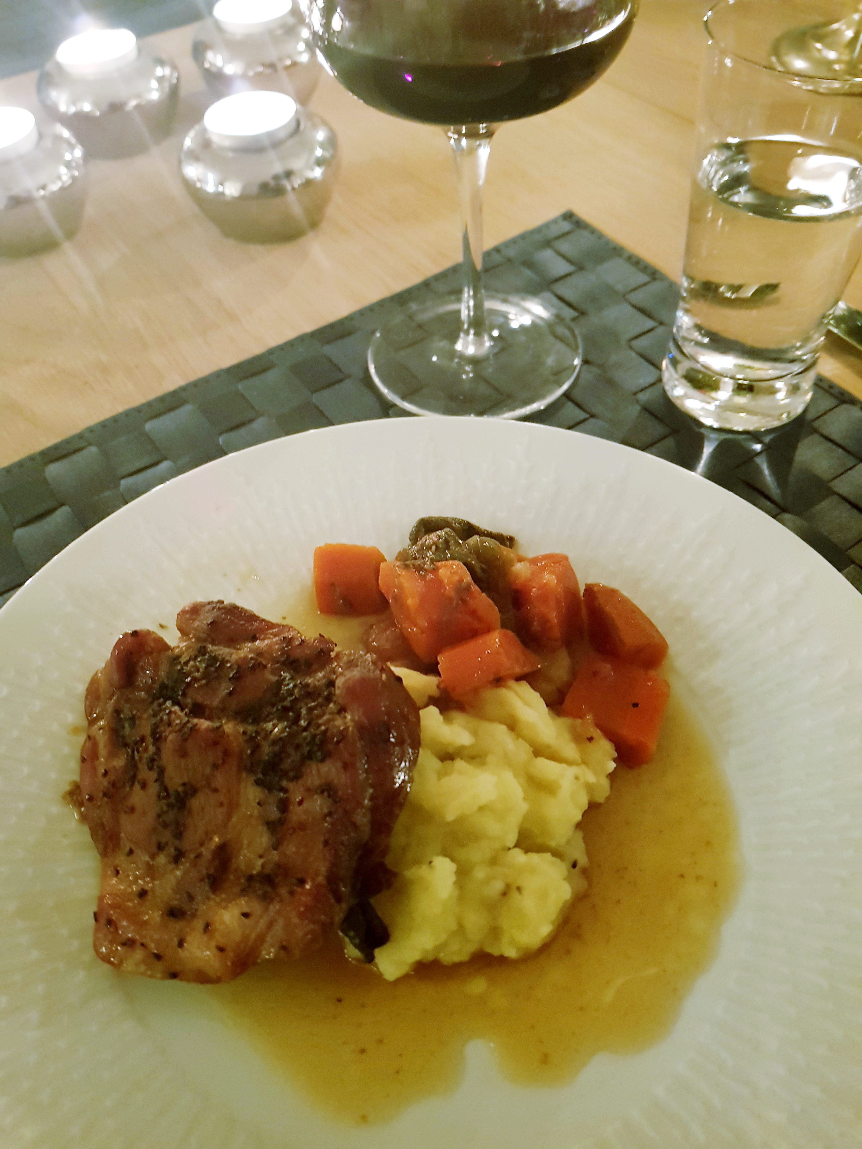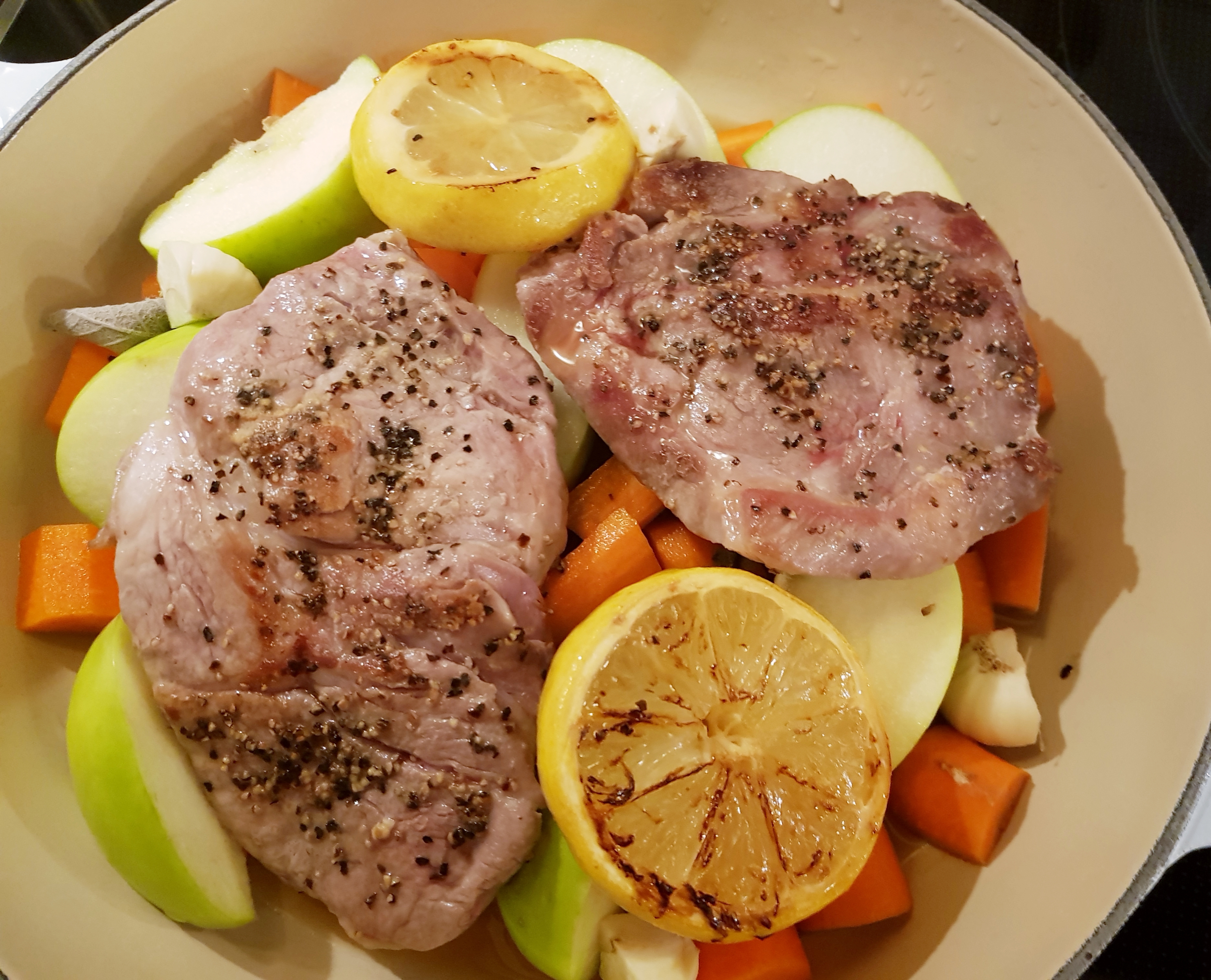 Nakkekoteletter av svin er en favoritt og aller best blir de hvis du har tid til å langsteke dem i ovnen. Svin krever mye krydder og salt syntes jeg og kotelettene ble derfor innsatt med mye grov pepper og salt før de ble brunet på begge sider i litt olje på en varm panne. Deretter ble de lagt på en seng av gulerøtter i biter og et grønt eple delt i båter samt noen hvitløksbåter i en ovnsfast gryte. Noen blader fra en salvie som fremdeles lever i balkongkassen og noen skiver sitron som ble stekt på pannen ble også plassert i gryten og litt eplejuice ble helt over. Epler og svin, salvie og svin, sitron og svin… supre kombinasjoner.