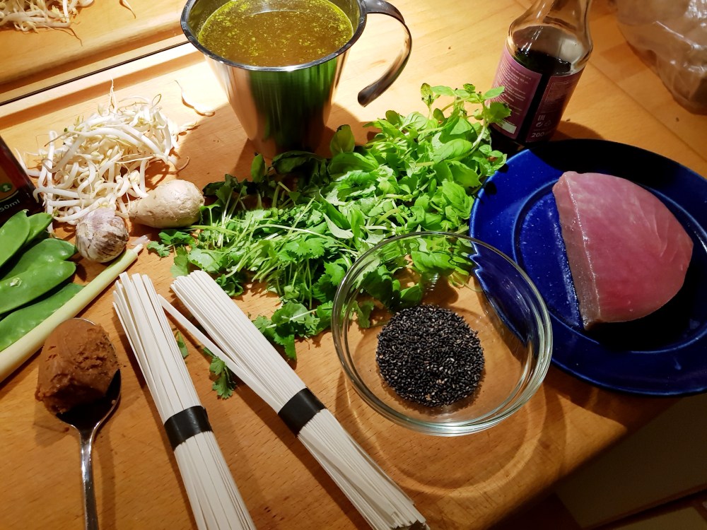 Laget så suppen. Jeg varmet opp buljongen og tilsatte ingefær, sitrongress, hvitløk og fiskesaus og kokte opp. Reduserte deretter varmen og tilsatte miso. Rørte godt til misoen var helt oppløst og passet på at suppa ikke kokte. Smakte til med noen dråper soya.