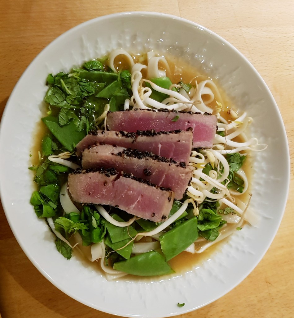 Fordelte nudlene i skåler, og øste suppen over. Tilsatte de grovhakkede sukkerertene, bønnespirene og urtene og toppet med tynne skiver av tunfisk.