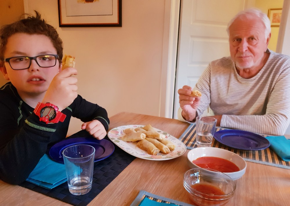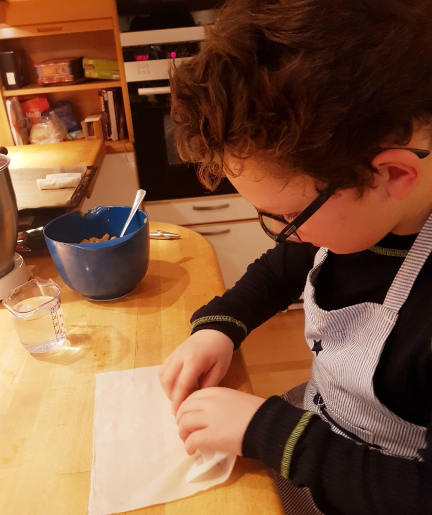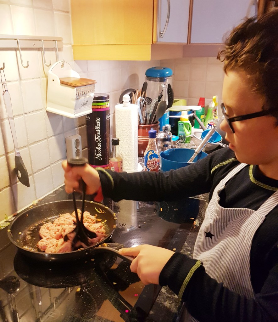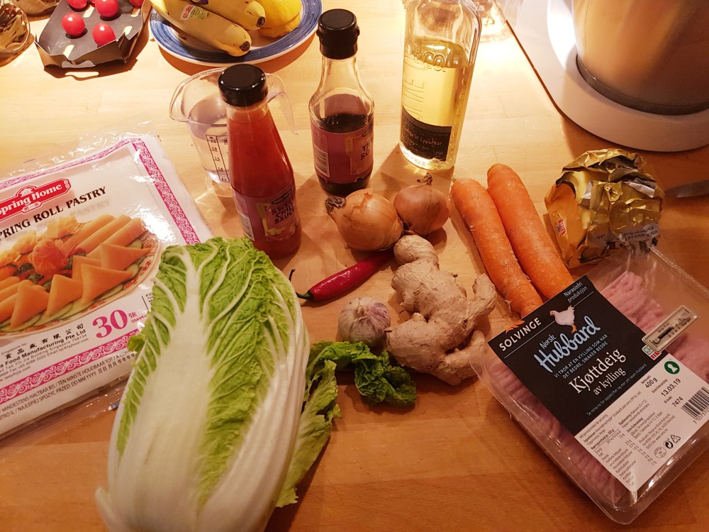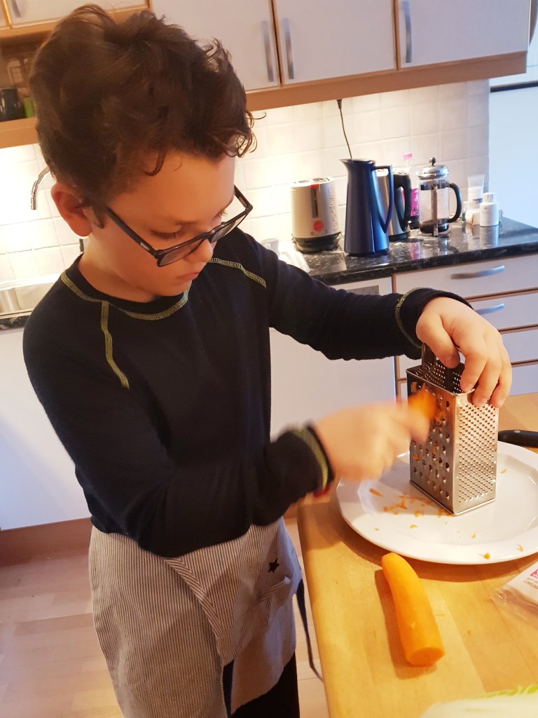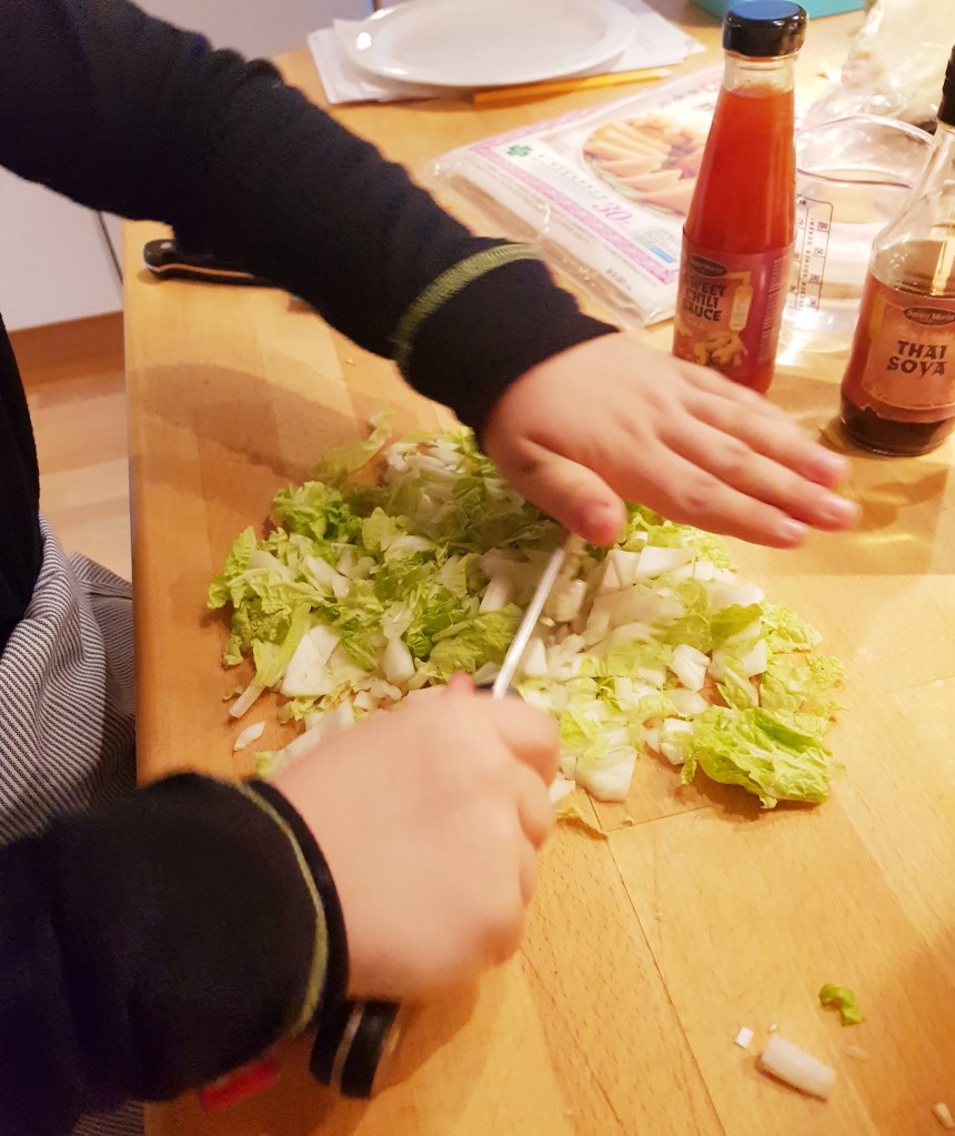 På matstart.no finnes det mange flotte oppskrifter som du kan bruke hvis du skal lage mat med barn eller hvis barn skal lage mat selv. Alt fra middag til kosemat. Inspirert av en slik oppskrift laget Tobias på snart 10 år, vårruller i går. Vi forandret litt på oppskriften slik at fyllet ble litt , men bare litt, mer hot og vi brukte kyllingkjøttdeig istedefor svinekjøttdeig og kinakål istedefor hodekål. Selv om vi delte på å lage selve rullene, var det Tobias som gjorde det meste (jeg ryddet).