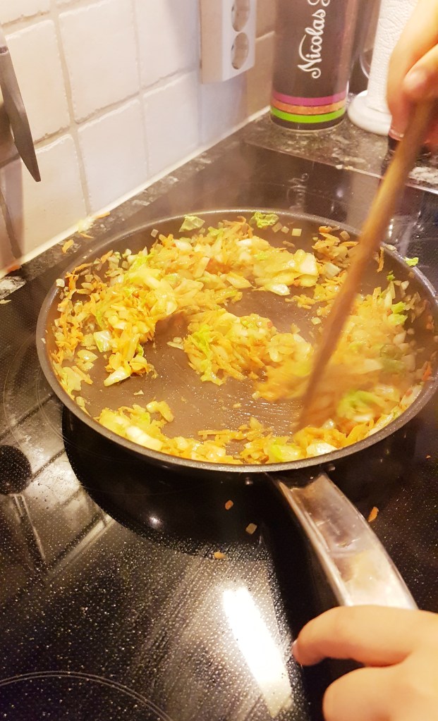 I en middels varm stekepanne ble først løkene stekt i en blanding av smør og rapsolje, 3-4 minutter under røring. Pass på så ikke hvitløken ble brent. Deretter ble kålet tilsatt og alt fikk steke videre i 3-4 minutter under røring før gulerøttene ble tilsatt sammen med 1 spiseskje soyasaus og 5 spiseskjeer chilisaus. Alt ble rørt godt sammen og overført til en bolle