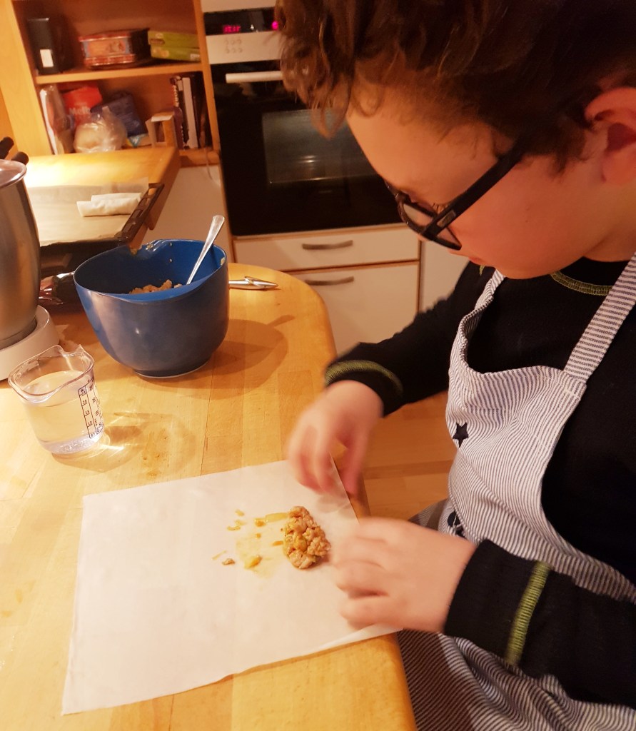 Bruk gjerne fingrene til å forme en liten pølse av fyllet før du dekker det med deig og ruller ca halve deigen. Deretter flater du ut delen på hver side av fyllet og bretter de begge to inn mot midten. Ha litt vann i enden av deigen som vil lime skjøten når du ruller ferdig. Vi syntes det var best å stryke vannet ut med fingrene men du kan bruke en pensel også.