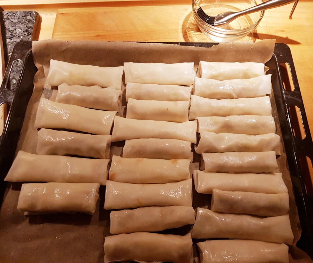 Et ark med filodeig ble lagt på en ren benk. En spiseskje av fyllet ble lagt midt på litt fra den kanten nærmest deg