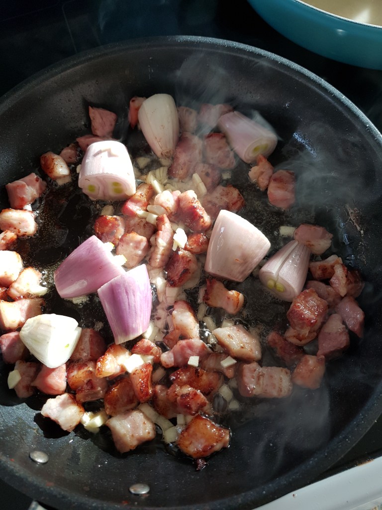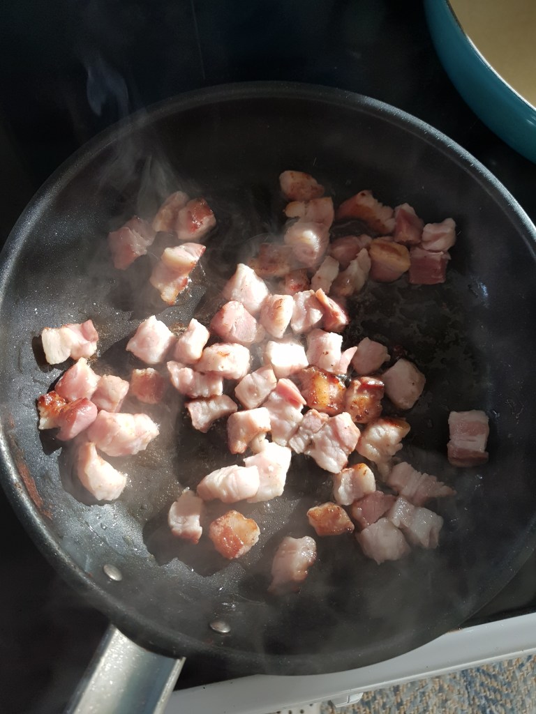Svoren ble fjernet fra baconstykket og resten ble skåret i små terninger og stekt på en middels varm panne uten ekstra fett