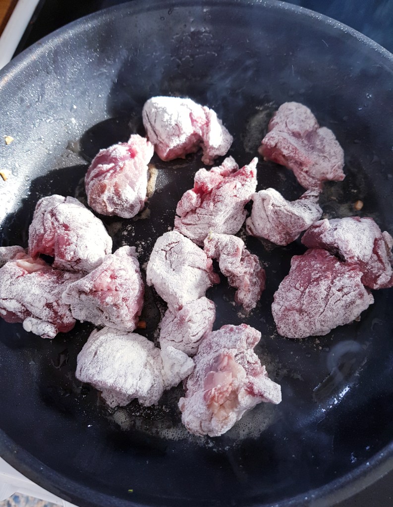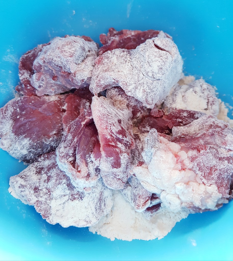 Oksekjøttet ble skåret i biter. I en bolle med mel ble kjøttstykkene dekket med mel