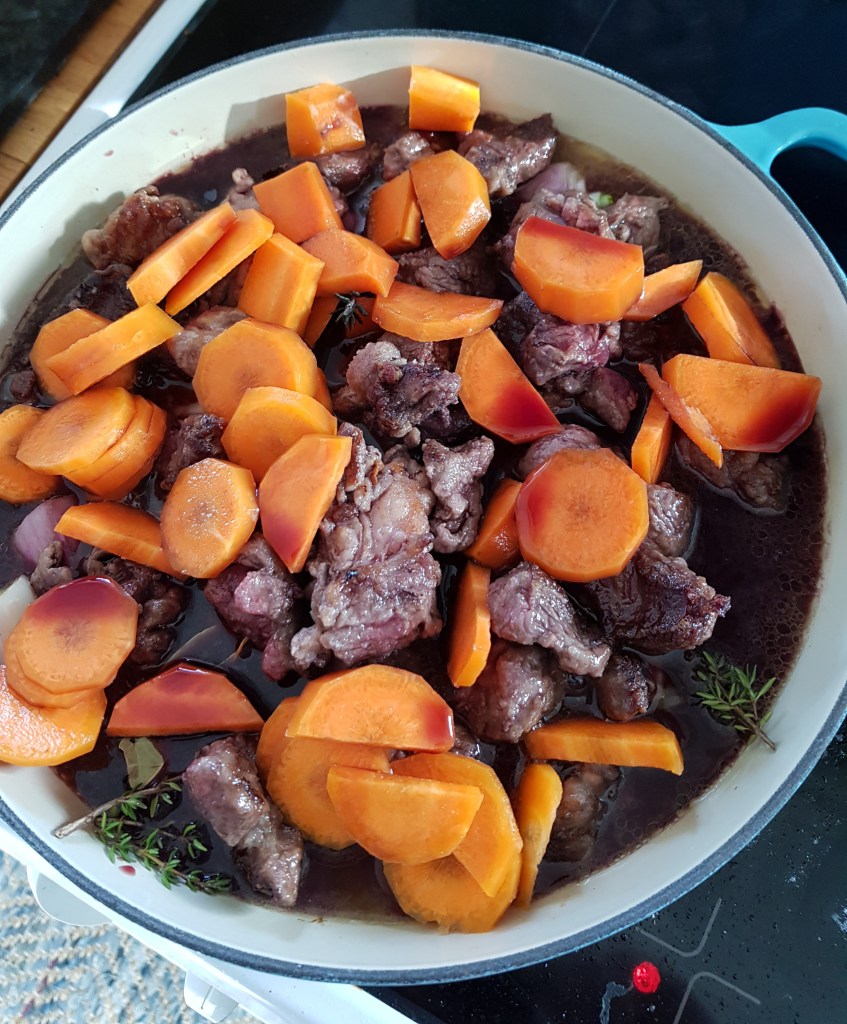 Når alt kjøttet var ferdigbrunet ble skiver av gulerøtter også tilsatt gryten sammen med vin, buljong, timiankvister, og laurbær