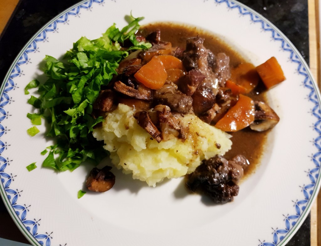 Kjøttgryten ble servert med hjemmelaget potetstappe og sprø grønn salat. Sterk og deilig smak…
