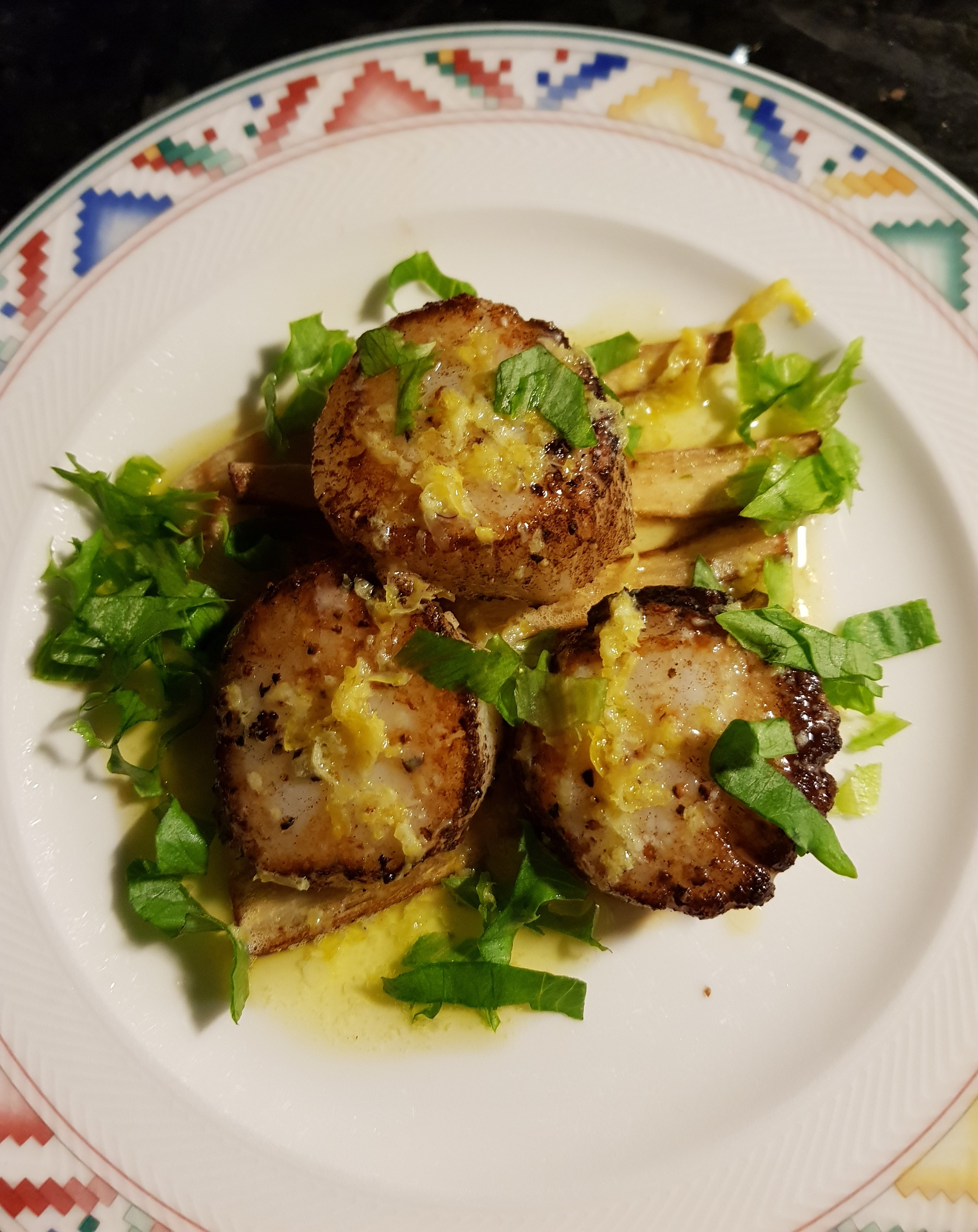 Pastinallskivene ble fordelt på to tallerkenerog kamskjellene ble steikt ca 30 sekunder på hver side i samme smøret som pastinakkene- brukte god varme. La kamskjellene oppå pastinakkskivene og fordelte sitronsmøret over. Retten ble servert med tynne skiver sprø salat og litt revet sitronskal på toppen. En typisk rieslingvin denne retten…