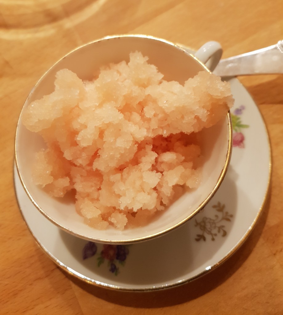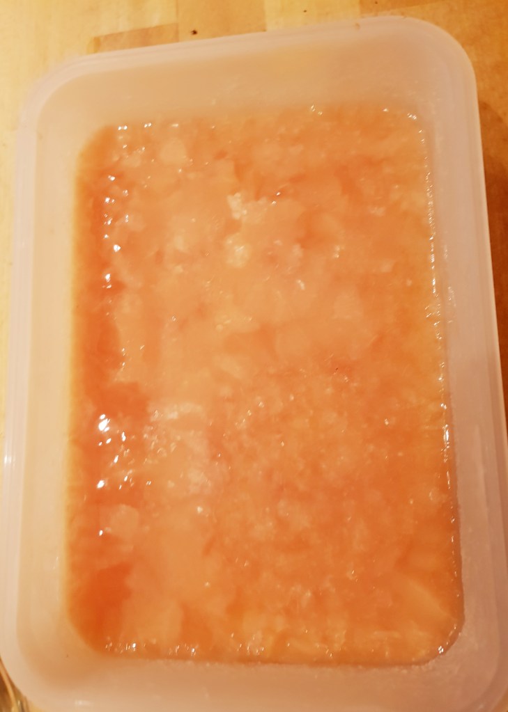 Sukkeret ble kokt opp med litt av grapefruktjuicen til det var oppløst. Deretter ble resten av væsken tilsatt sammen med saltet. Alt ble helt i en flat beholder. Jeg brukte en lav plastboks. Det er viktig å få litt overflate samtidig som det tar kortere tid å fryse granitéen.