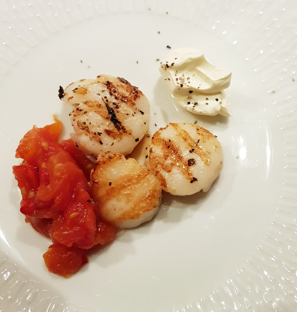 Denne gangen ble den servert med kamskjell som ble grillet 1-2 minutter på hver side og krydret med salt og pepper. En enkel smårett hvor chutneyen kan lages på forhånd og du bare må steke skjellene rett før. Husk en klatt creme fraich til..