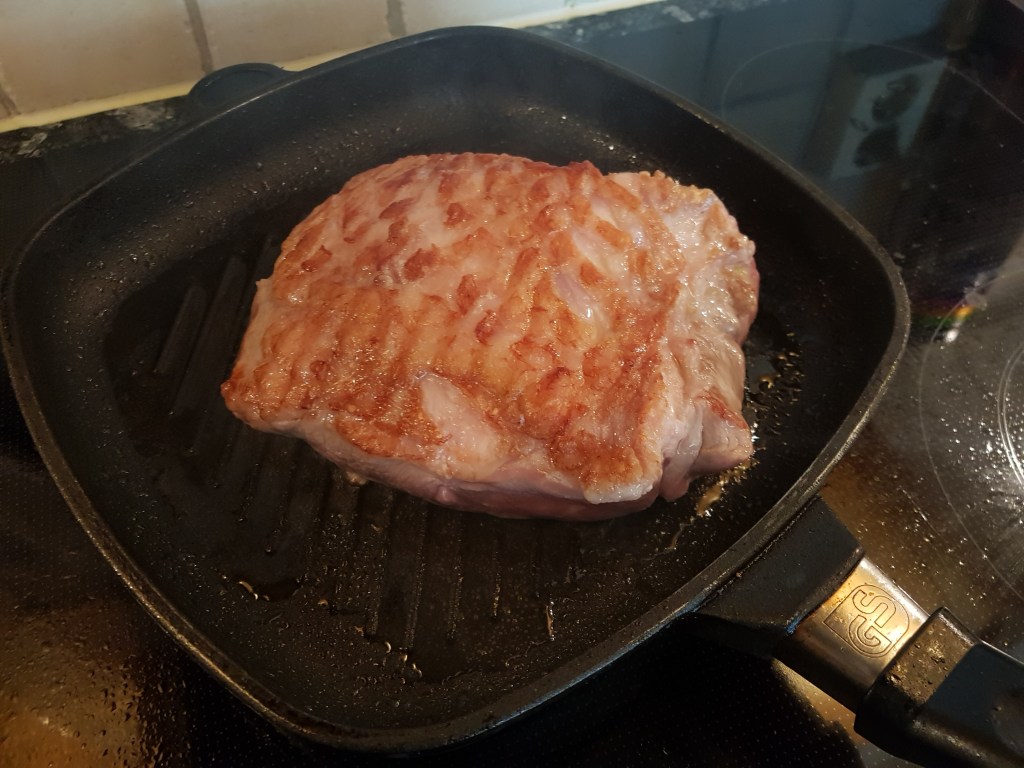 Det er viktig at kjøttet er romtemperert. Fettlaget ble snittet med en skarp kniv og hele kjøttstykket ble gnidd inn med grov pepper. Kjøttet ble brunet på alle sidene i en varm grillpanne