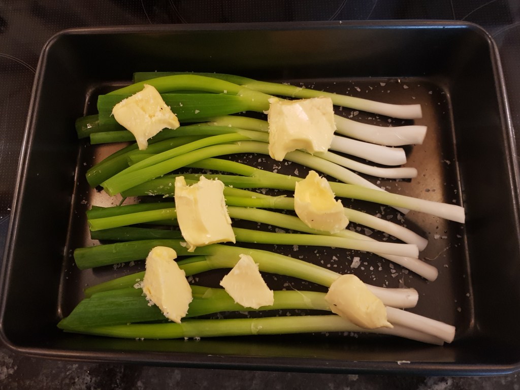 Vårløkene ble renset, men mye av det grønne ble beholdt. De ble lagt i en liten langpanne med noen skiver smør over og et dryss med flaksalt. De ble stekt midt i ovnen ved 200 grader i ca 15 minutter. Til tross for den fantastiske smaken mente noen at de var stekt for lenge så man må prøve seg litt frem.