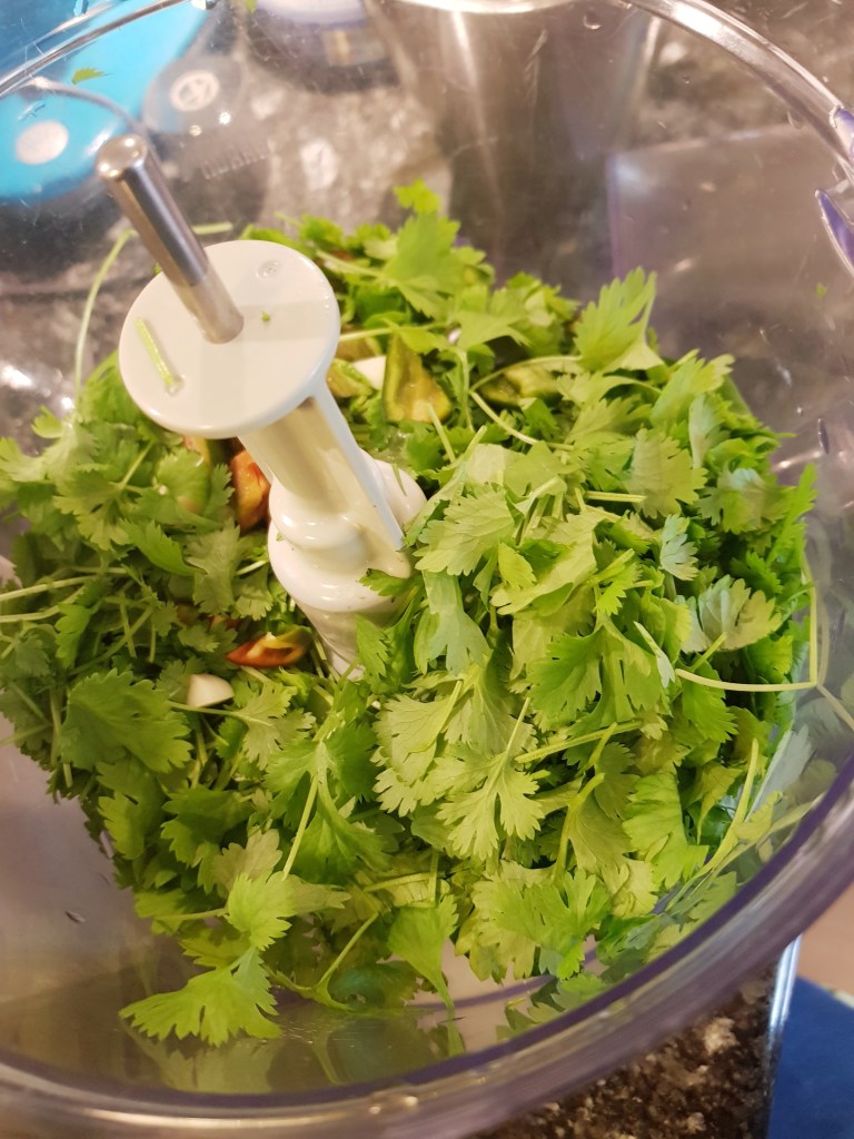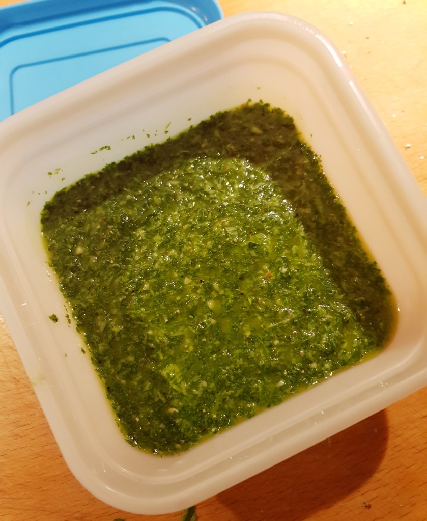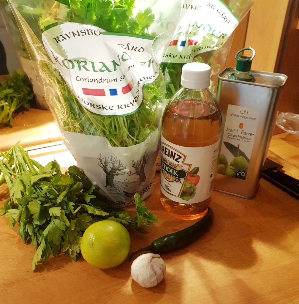 For å få ønsket konsistens måtte jeg tilsette noen dråper olivenolje. Sausen ble smakt til med salt og pepper. Den skal være frisk med smak av urter og hvitløk og du skal ane chilien i ettersmaken.