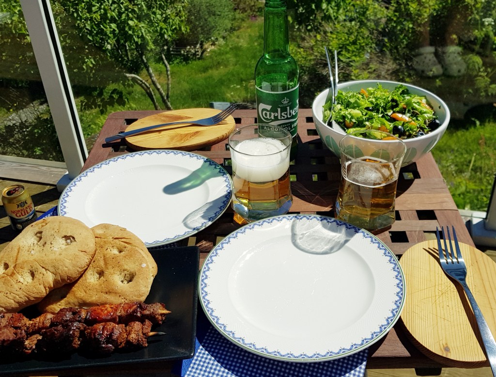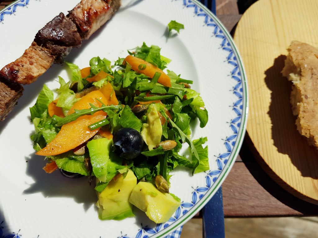 Denne gangen ble salaten servert til grillet kjøtt og porsjonsfoccacia og en kald øl og en nydelig utsikt- kan det bli bedre???