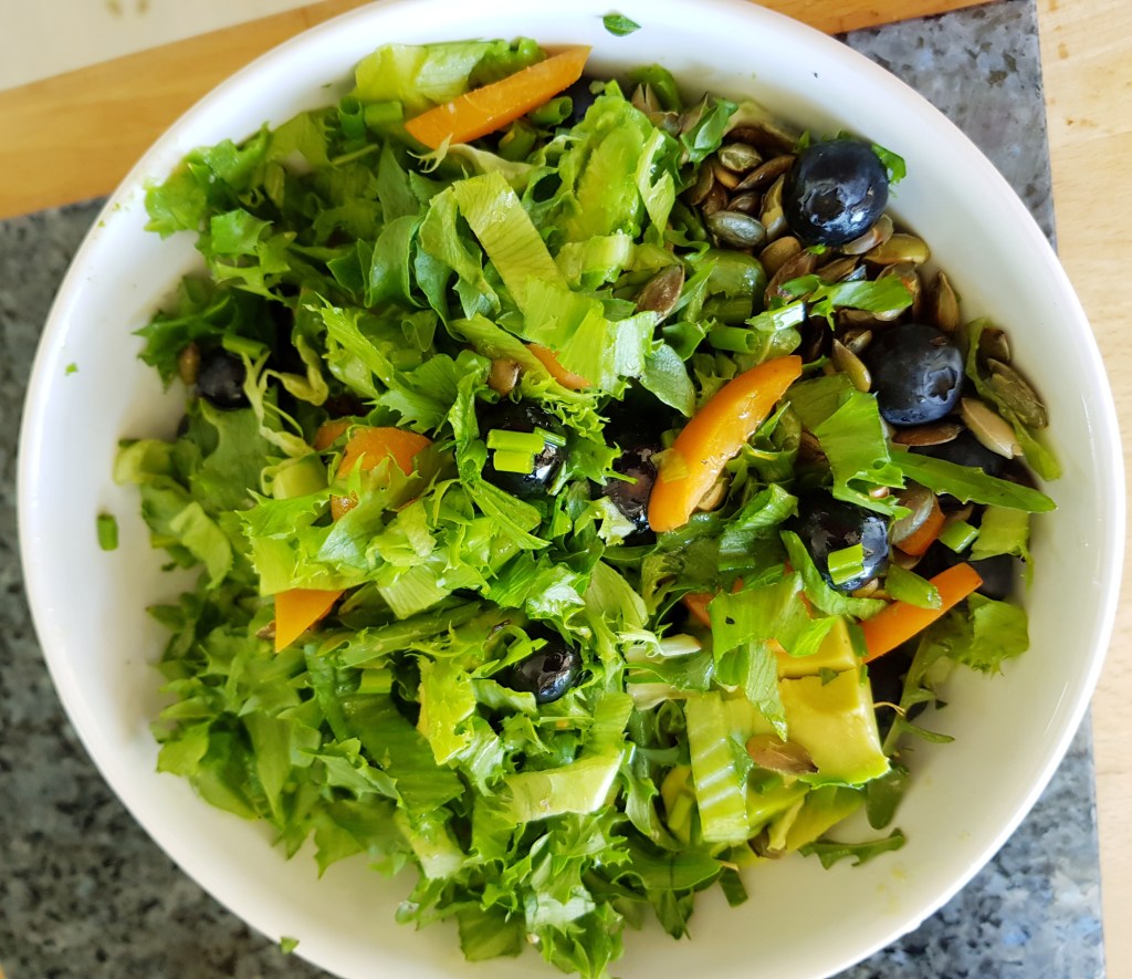 Aprikosene ble skåret i skiver, avocadoene ble skrelt og skåret i biter, salaten ble rullet sammen og skåret i tynne strimler. Alt ble blandet i en skål og tilsatt blåbær og ristede gresskarkjerner. Dressing ble laget av olivenolje og saften fra en lime og smakt til med flaksalt og grov pepper. Hvis du syntes det er for surt kan du søte med litt flytende honning. Dressingen ble helt over og blandet inn i salaten og gressløk og litt ruccola ble klippet over. Smaken av aprikoser er så fin sammen med avocadoen, og blåbærene og gresskarkjernene tilfører en fin sprøhet til salaten.