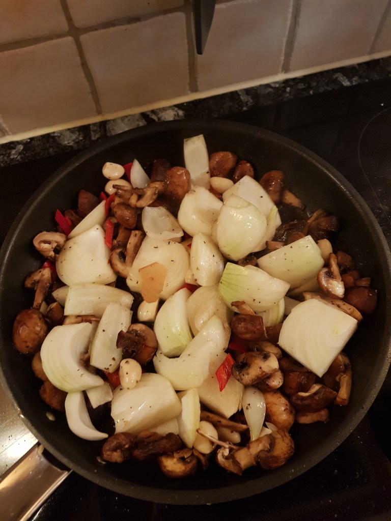Løken ble renset og delt i båter og tilsatt til pannen sammen med de marinerte hvitløksbåtene og oppskåret chili.