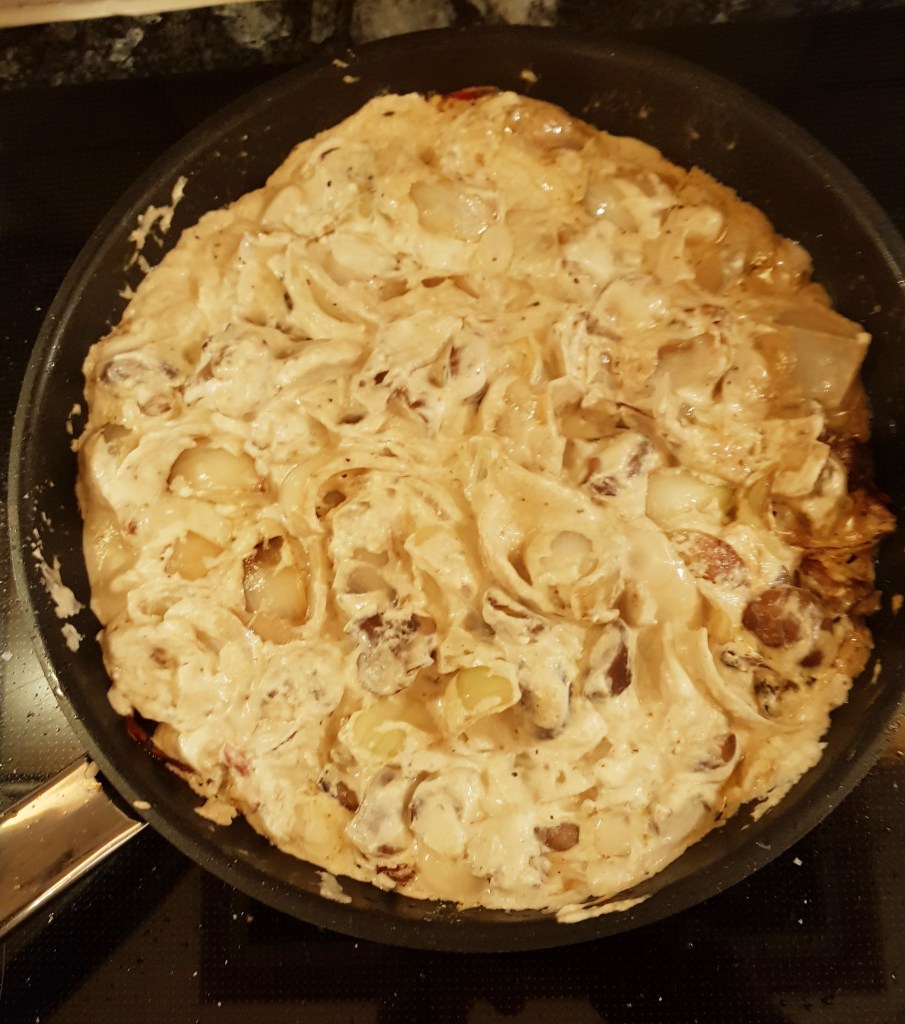 Stekte videre til løken var begynt å bli myk. Tilsatte så creme fraiche
