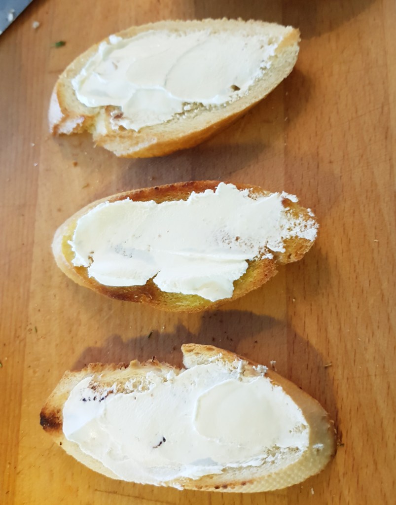 Skjær soppen i mindre biter og hvitløken i tynne skiver. Stek begge i litt olivenolje og tilsett salt og grov pepper. Smør snøfriskosten på skivene