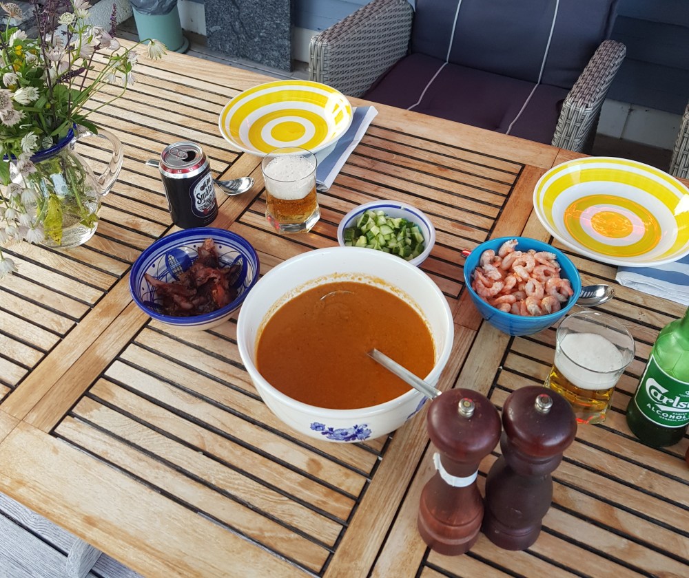 Når det har vært veldig varmt hele dagen og temperaturen fremdeles er over 20 grader og du må ha et salt måltid- hva passer vel bedre da enn en kald suppe. Vi hadde vært bortreist noen dager og da er det alltid noen litt slappe grønnsaker i kjøleskapet. Jeg fant noen stilker med stangselleri, en halv litt skrukkete chili, en halv rødløk, flere halvstore tomater, et blomkålfeste med blader, sitrongress, en rød paprika, noen tørre vårløk og en pastinakk. Alt dette skar jeg opp i grove biter som fikk en omgang på panna i litt rapsolje før alt ble kokt i vann tilsatt litt kyllingfond fra flaske og litt ferske urter som timian og storbladet persille. Da alt var mørt kjørte jeg hele blandingen i en foodprosessor til det var en grøt. Jeg hadde ikke skrelt stangselleristilkene så det var endel trevler der, derfor tok jeg bryet med å presse det hele gjennom en melsikt. Det er litt jobb så det lønner seg å bruke gulrotskrelleren på stangsellerien på forhånd. Suppa ble smakt til med salt og pepper og noen dråper sitronsaft og avkjølt på benken i flere timer. Her kan du bruke absolutt det du har. Fargen på suppa bærer preg av at den inneholder tomater og rød paprika, fargen vil være anderledes med andre grønnsaker.