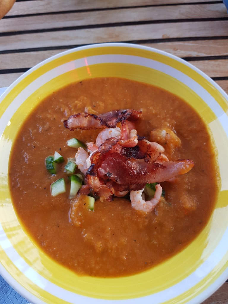 Suppa ble servert med sprøstekt bacon som akkurat var gått ut på dato, noen ferdigrensede reker fra fryseren som var en rest etter et rekemåltid og små biter av en litt slapp agurk hvor frøene var fjernet. En klatt rømme hadde nok også vært godt. Kombinasjonen av bacon og reker var super!
