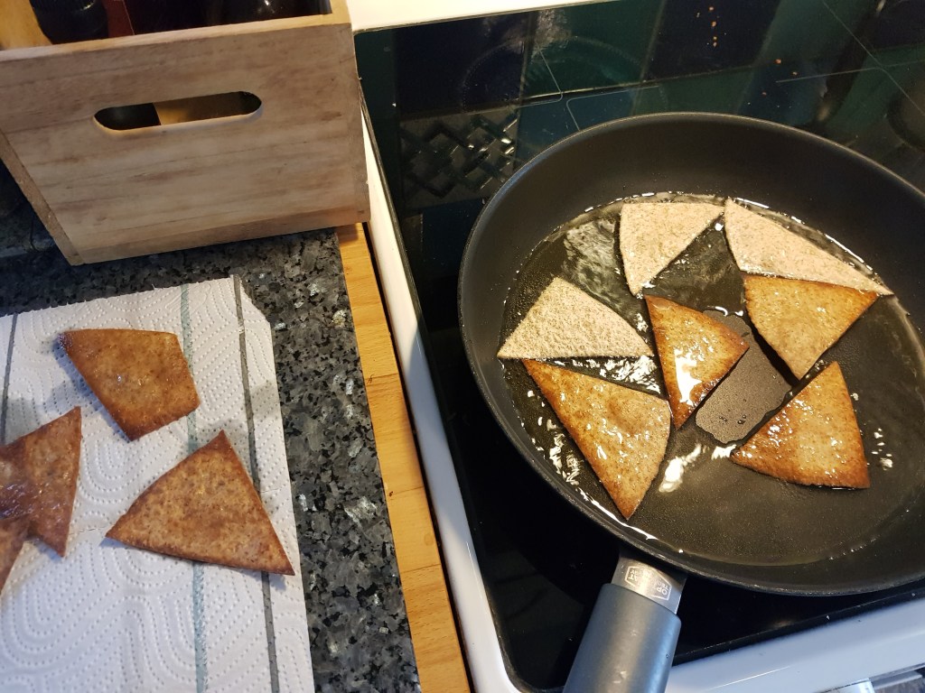 Tortillaen ble klippet opp i små trekanter og stekt i rapsolje ved høy varme. De ble lagt på et tørkepapir for å fjerne noe av oljen etterpå