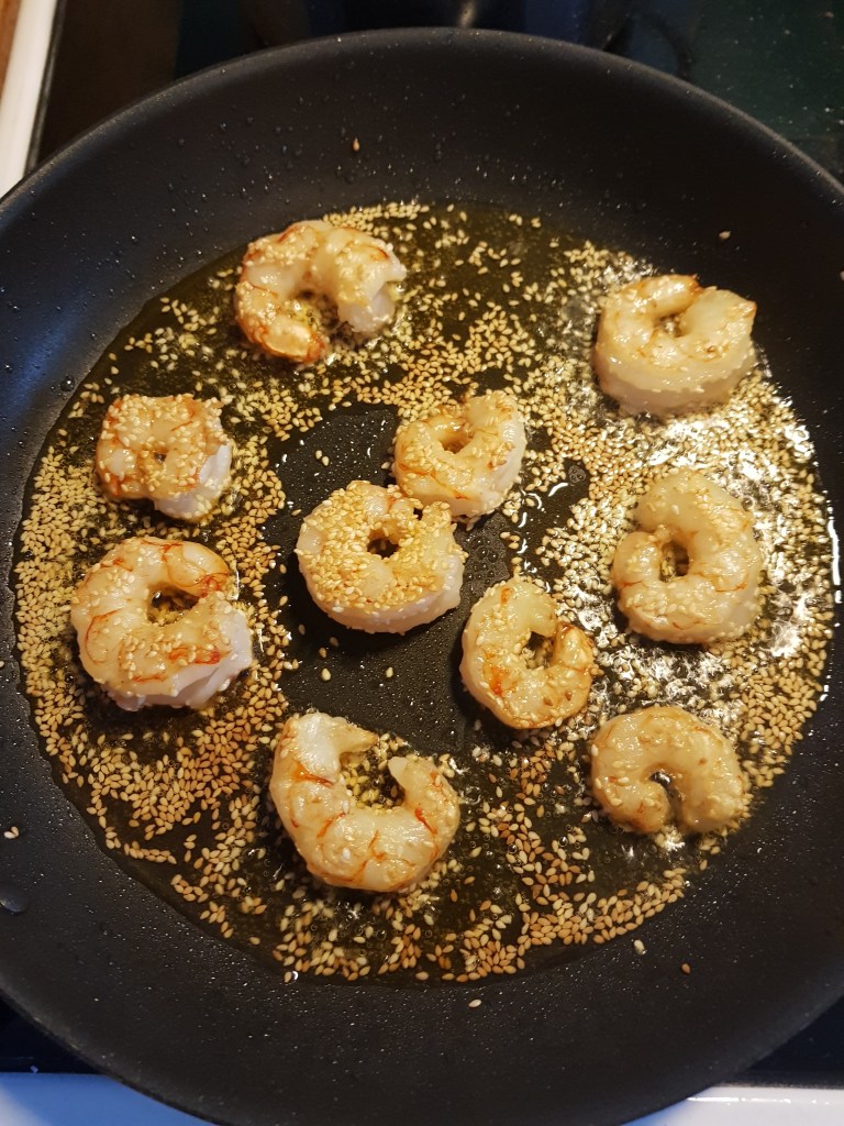 Mesteparten av sesamfrøene faller av under stekingen men de gir veldig god smak på oljen. Alt ble plassert på et fat