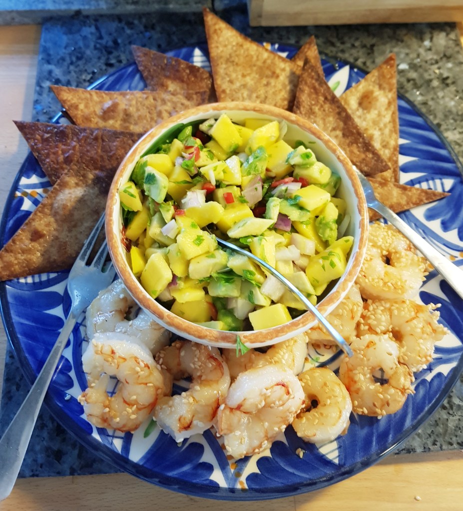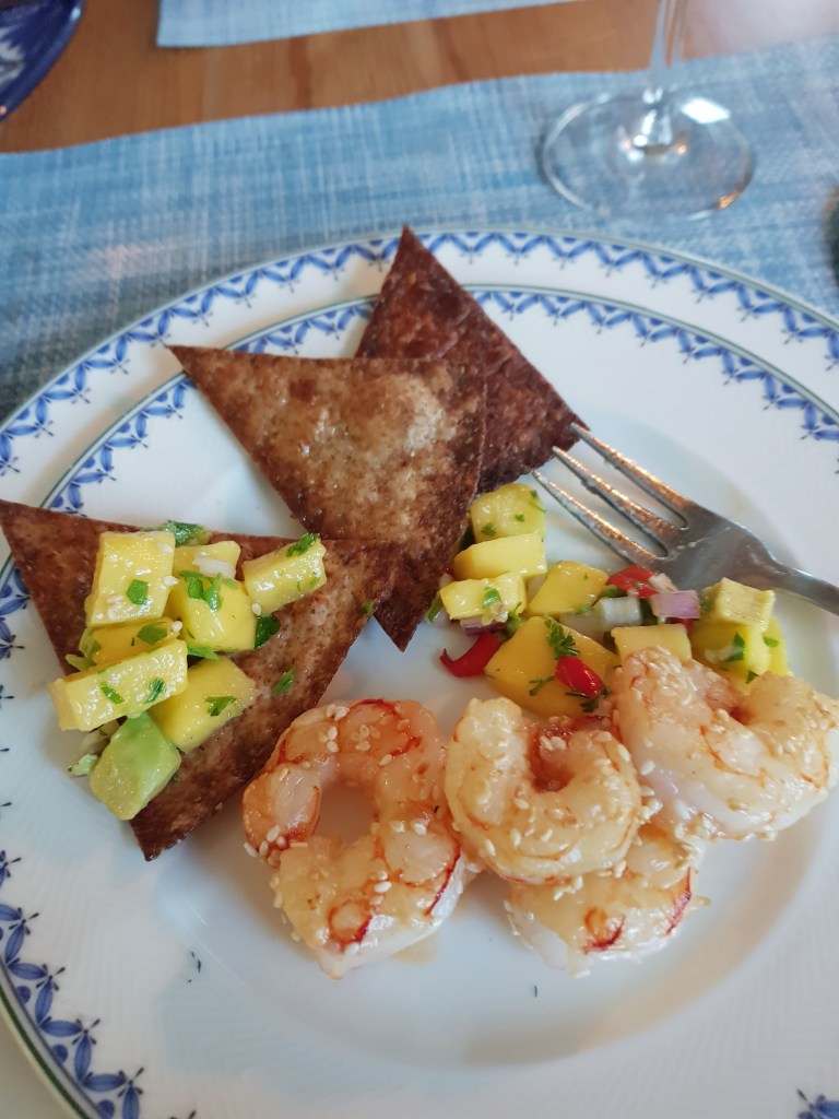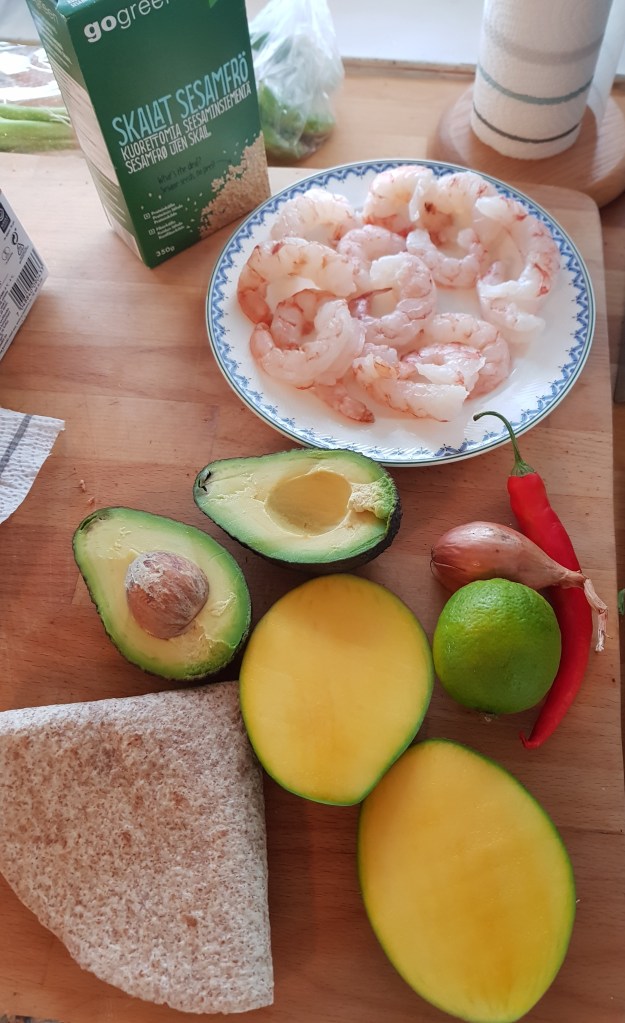 Mango, avocado, løk og chili ble skåret opp i mindre biter og blandet med saften av en halv lime. Hakket persille ble tilsatt.