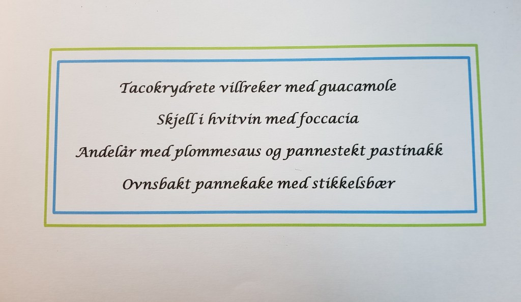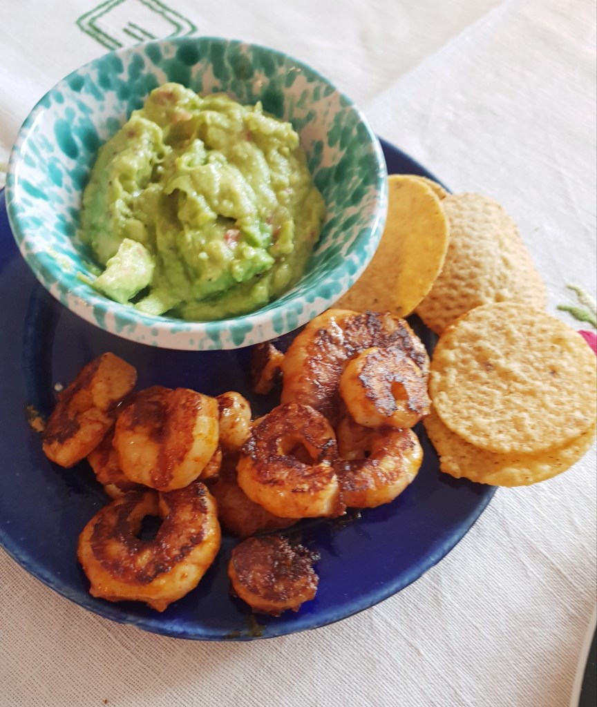 Guacamole ble laget av 1 avocado, et halvt fedd hvitløk i biter, en halv rød chili uten frø og hinner , salt, pepper og saften av en halv lime. Alt ble most med en stavmikser, det kan godt være noen små biter i den. Smak om den må ha mer krydder. 8 -10 tinte villreker uten skall ble dyppet i en blanding av tacokrydder og olje (1 spiseskje tacokrydder spedd ut med litt olje slik at det blir en jevn blanding) og stekt ca 2 minutter på hver side i en tørr varm panne. Rekene ble servert med guacamolen og noen nachos.