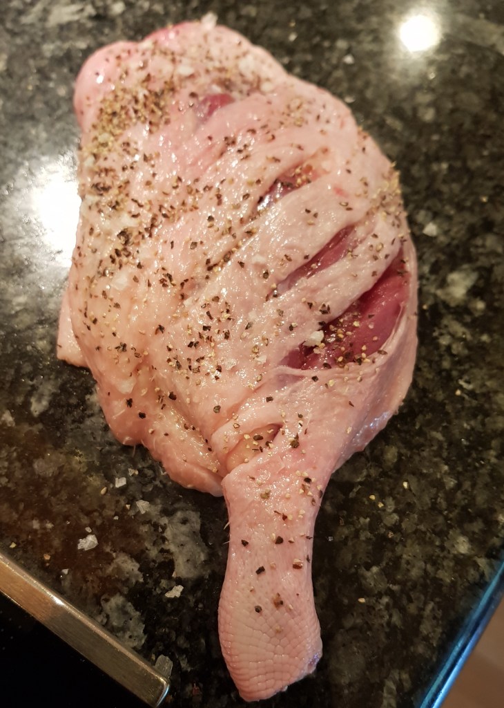 Siden vi skulle ha småretter har jeg bare brukt 1 andelår her. Skinnsiden ble snittet og låret ble satt inn med salt og grov pepper.