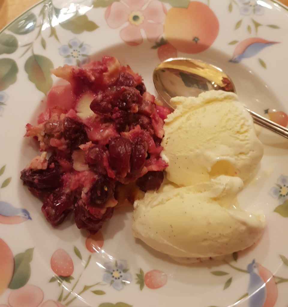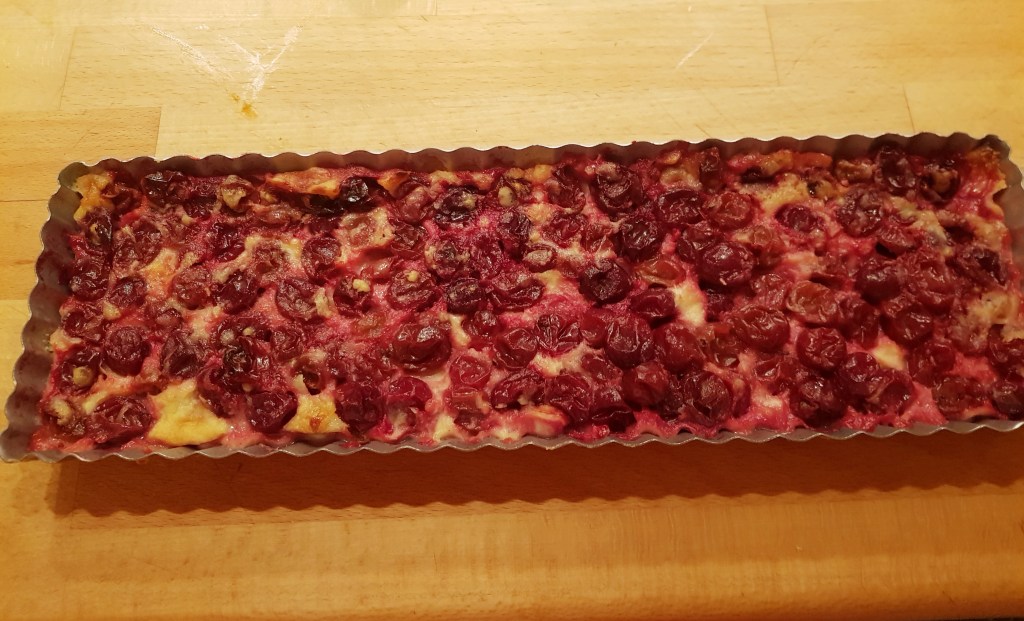 Denne retten heter egentlig clafoutis og den består av en litt tykk pannekakerøre blandet med bær. Den stekes i en terteform. Jeg brukte uheldigvis en terteform med løs bunn, noe som førte til at noe av røren rant ut under stekingen- resultatet så litt miserabelt ut, men smaken- ja den var super, søtt og syrlig på en gang.