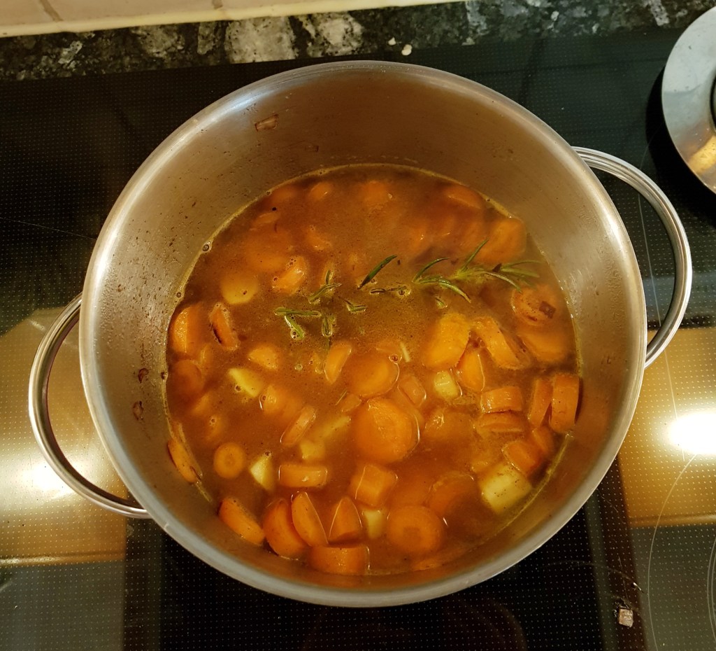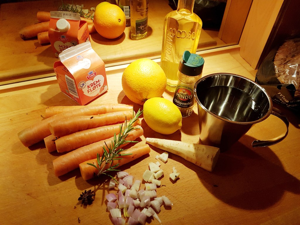 Gulerøtter med eller uten skall (jeg skreller ikke sommergulrøtter), løken og hvitløken ble skåret opp i små stykker. Litt olje ble varmet i en gryte og løken, hvitløken, stjerneanisen og chilien ble surret litt slik at løken ble blank. Tilsatte så gulrøttene og en kvist rosmarin. Alt fikk surre i ca 5 minutter med litt røring av og til. Saften og revet skall av appelsinen ble tilsatt sammen med vannet. Suppen fikk koke i ca 25 minutter- litt avhengig hvor små biter du lager av gulrøttene. Det er viktig at gulrøttene ikke koker for lenge for da mister de mye av smaken- likevel må de jo være så mye kokt at du får most dem.