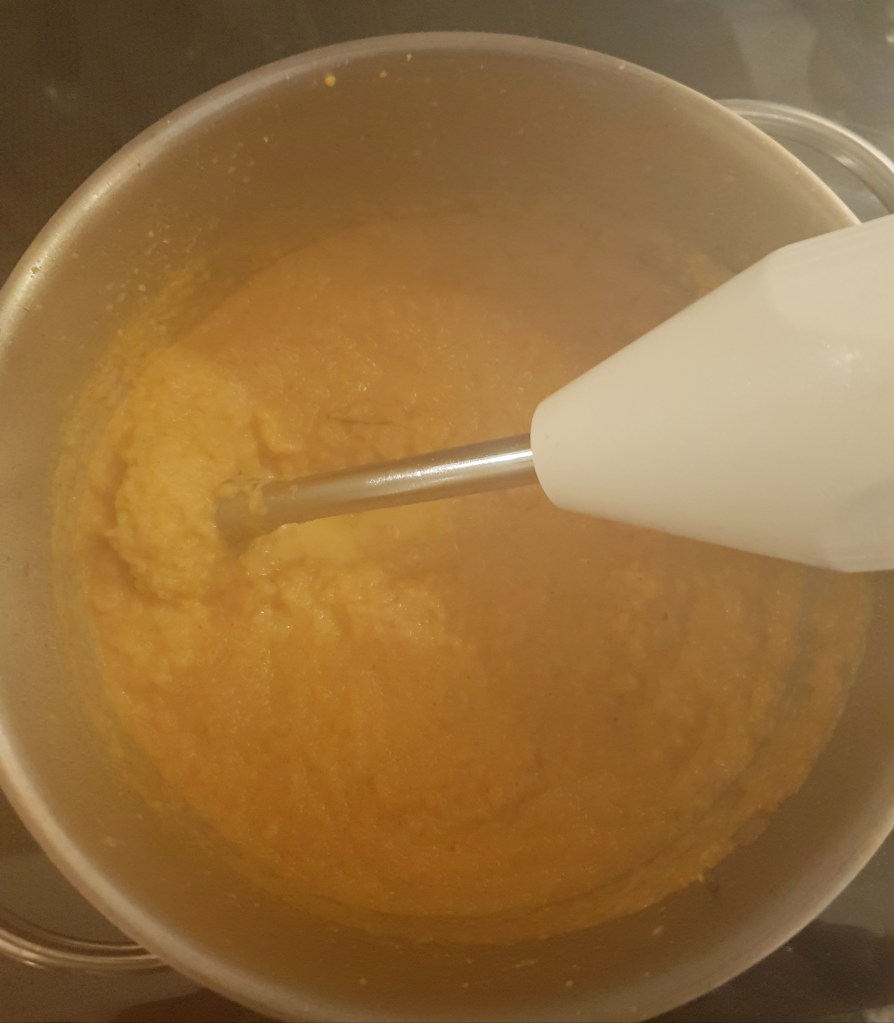 Roasmarinkvisten ble fjernet og fløten tilsatt og suppen fikk koke 2-3 minutter før den ble blendet med en stavmikser