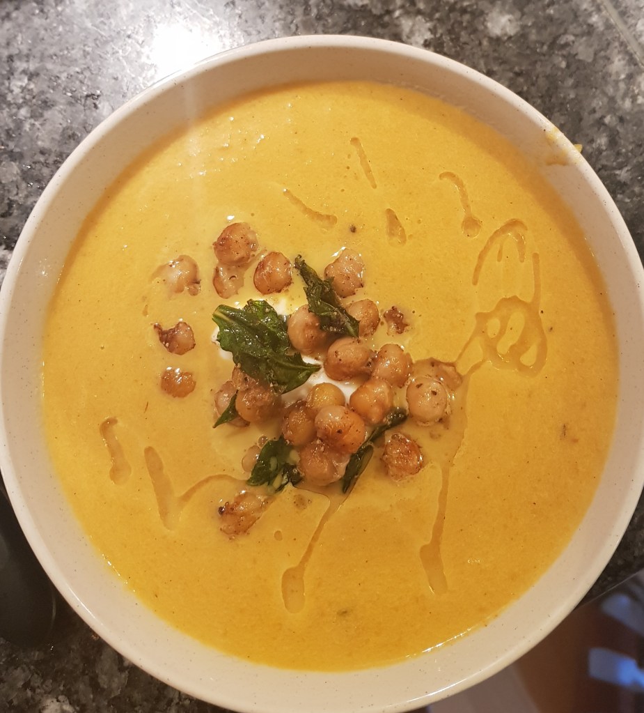 Supper er supre både til lunsj og til middag. Her har jeg brukt rester fra kjøleskapet og laget en gulrotsuppe med stekte kikerter. Kikertene fra ferdig kokte på boks. Du må selvsagt gjerne koke kikerter selv- det krever bare litt planlegging siden de må ligge i vann over natt og koke en stund før de er ferdige. Bruker du hermetiske er det viktig å skylle ertene godt. Jeg fryser ned det jeg ikke bruker av kikertene så har jeg til neste gang.