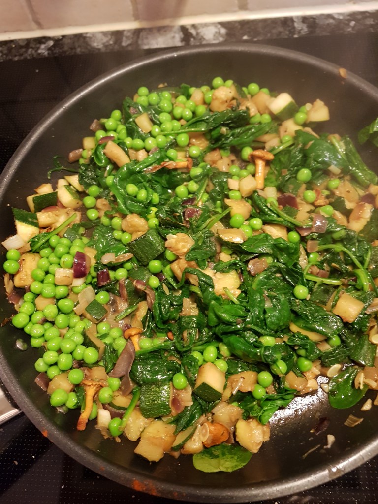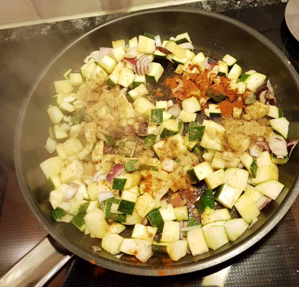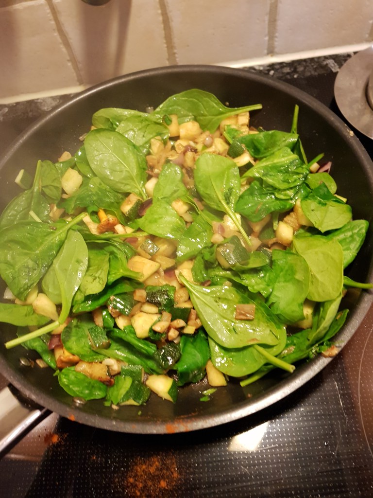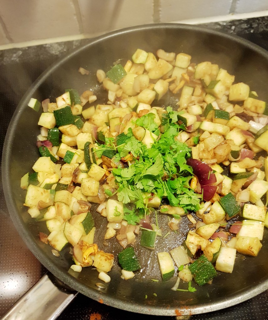 Løk og hvitløk ble skåret i små terninger og stekt i en panne sammen med squash i terninger. Røkt paprika og spisskummin ble tilsatt etter 2-3 minutter og alt fikk steke videre til squashen hadde fått litt farge. Halvparten av korianderen inkludert stilker, ble hakket og tilsatt. Spinaten ble tilsatt litt om gangen. Rørte godt mellom hver gang. Tilsatte mer når spinaten hadde falt sammen. Deretter ble de tinte ertene tilsatt.