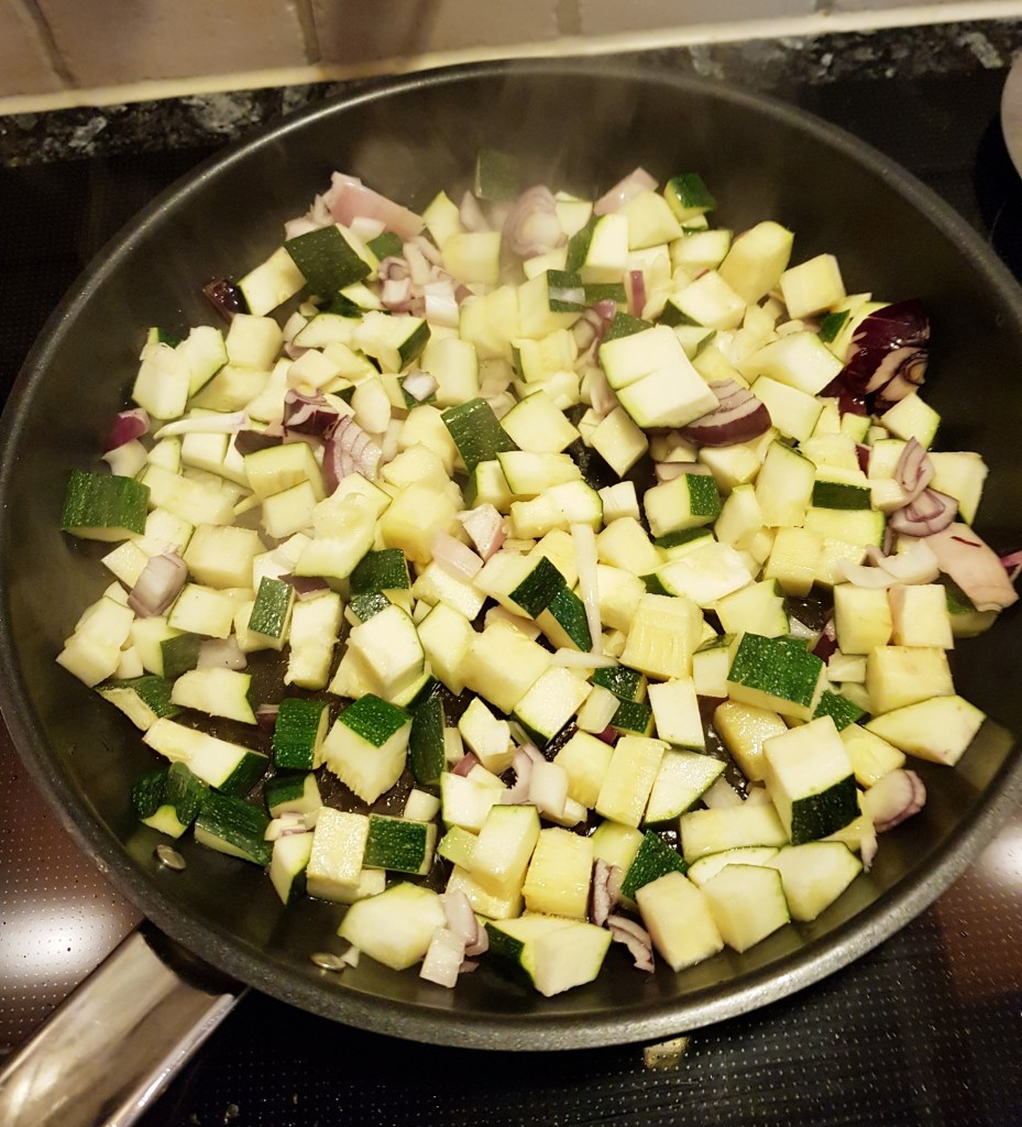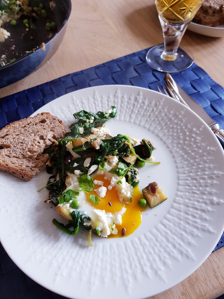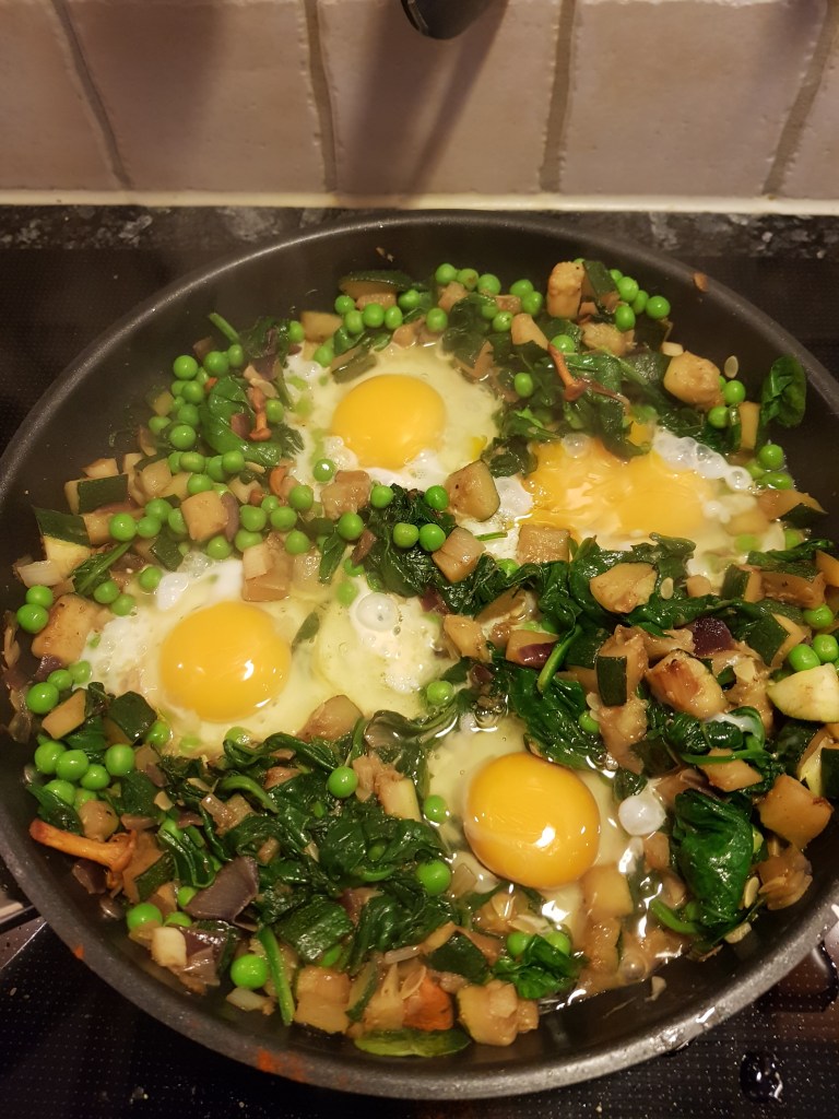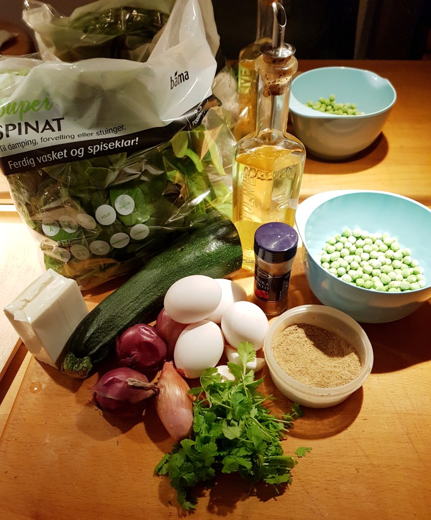 Løk og hvitløk ble skåret i små terninger og stekt i en panne sammen med squash i terninger. Røkt paprika og spisskummin ble tilsatt etter 2-3 minutter og alt fikk steke videre til squashen hadde fått litt farge. Halvparten av korianderen inkludert stilker, ble hakket og tilsatt. Spinaten ble tilsatt litt om gangen. Rørte godt mellom hver gang. Tilsatte mer når spinaten hadde falt sammen. Deretter ble de tinte ertene tilsatt.