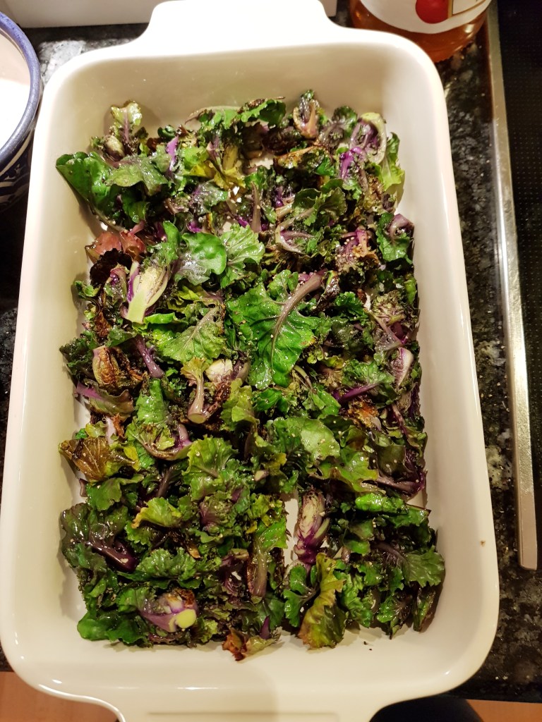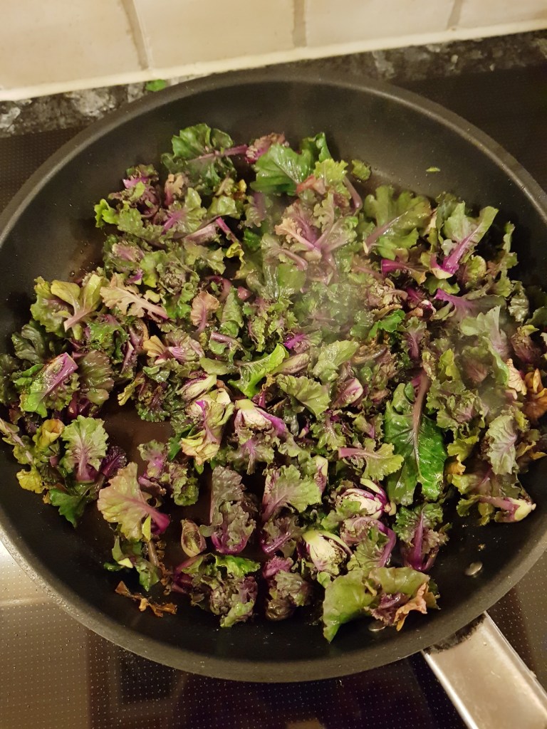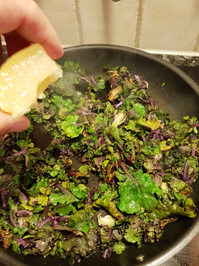 De groveste stilkfestene ble fjernet på kålen og de største ble delt i to. Skylte kålen godt og lot den renne av en stund. Varmet en stor panne og stekte kålen raskt i litt olje til den hadde fått litt farge. Presset en halv sitron over og krydret med salt og grov pepper. Kålen ble deretter overført til en ildfast form.