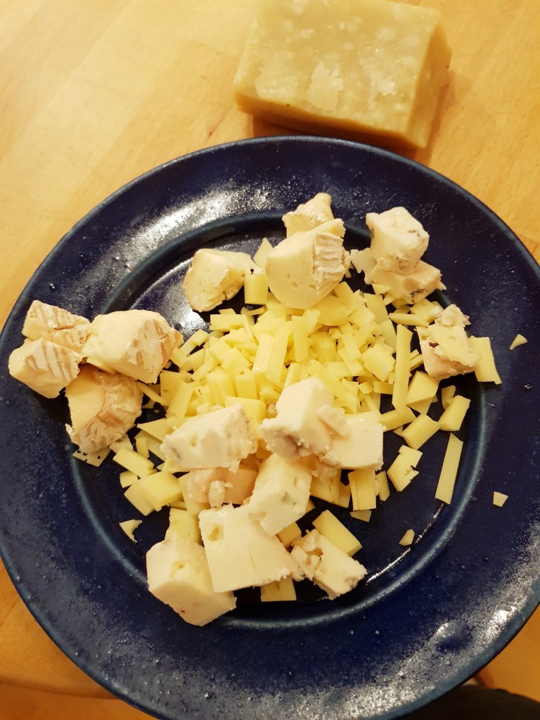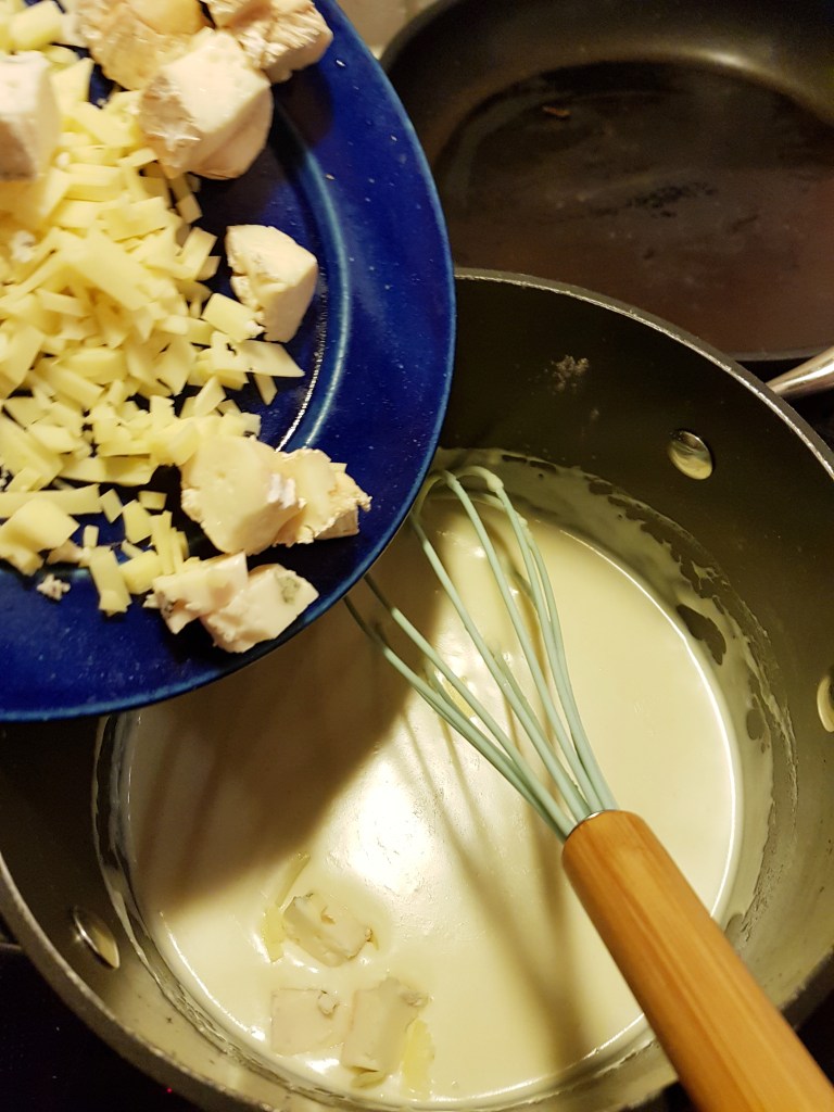Laget så en hvit saus på vanlig måte med smør, mel og melk. Sausen fikk koke et par minutter mens jeg rørte med en visp hele tiden for å unngå klumper. Trakk deretter gryta bort fra varmen og rørte inn osten litt etter litt til alt var smeltet. Her har jeg brukt Jarlsberg pluss noen biter av en godt moden brie og en godt moden roquefort. Bruk de ostene du har tilgjengelig. Bruker du andre oster en gulost, får du en annen smak på sausen som høyner måltidet.
