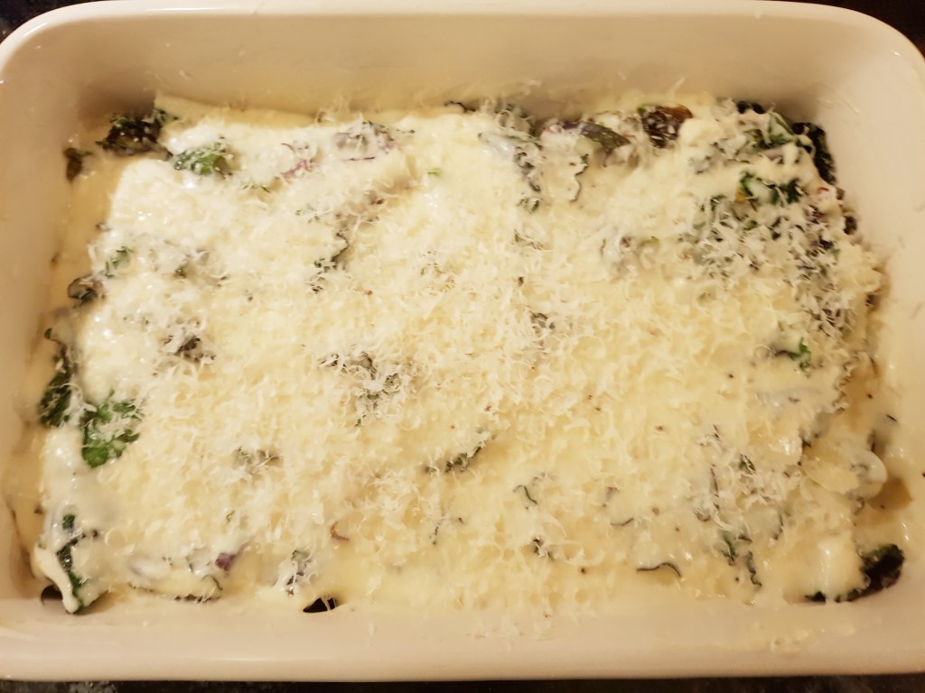 Det hele ble dekket av revet parmesan før formen ble satt i ovnen ved 220 grader i ca 15 minutter