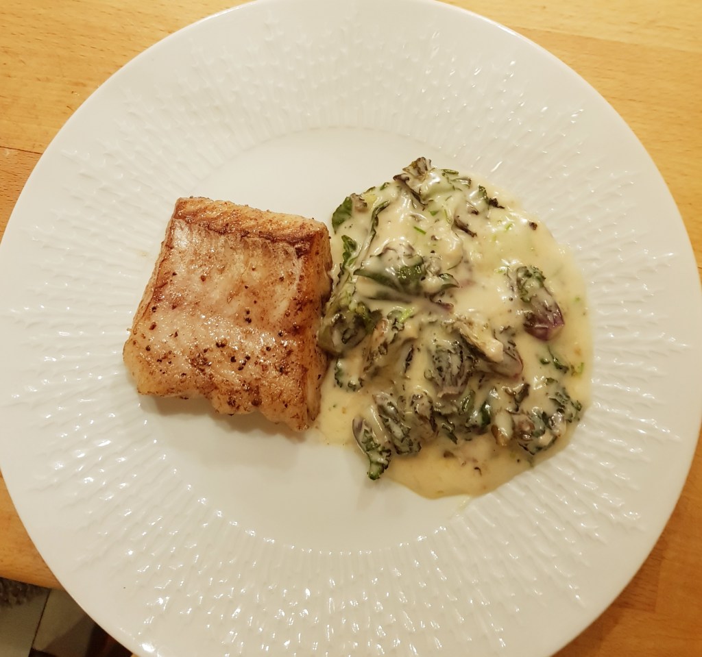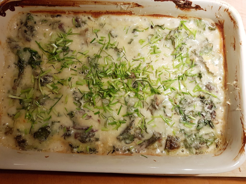 Drysset klippet gressløk over og serverte- denne gangen til stekt lysingfilet. Gratengen var kjempegod- den var også god kald så mye av restene forsvant i løpet av kvelden…