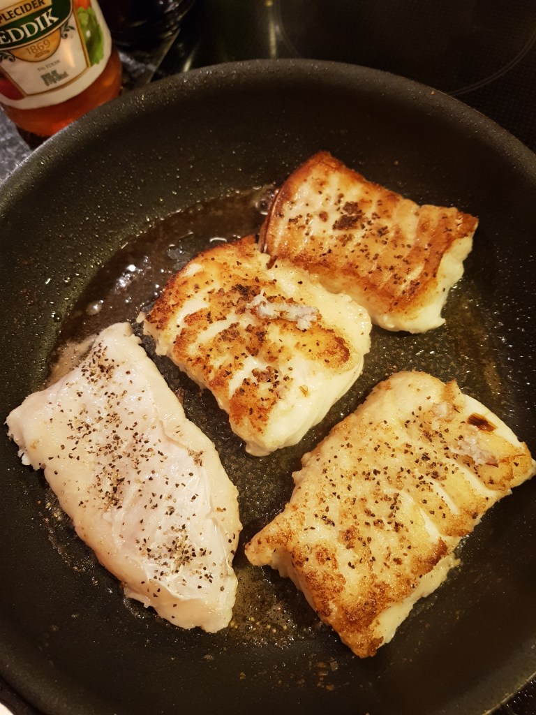 Da grønnsakene var nesten ferdige, varmet jeg opp en annen panne. Stekte fiskestykkene som også fikk et dryss med grov pepper, på begge sider i rapsolje. Da fiskestykkene var hvite nesten igjennom snudde jeg dem og stekte dem et lite minutt på den andre siden.