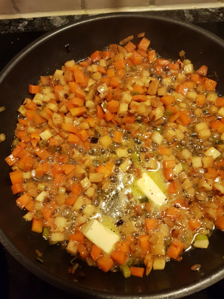 Filéten ble skåret i porsjonsstykker og drysset med salt. Deretter ble grønnsakene renset og skåret i små terninger som ble stekt i en middels varm panne i rapsolje noen minutter. Pass på så ikke hvitløken blir brent- den tåler lite og blir beisk hvis den blir mye stekt.